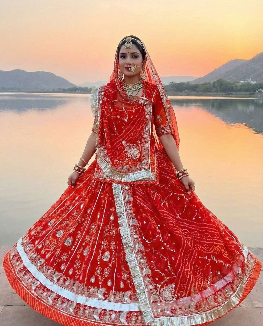 Heavy Boutique Designer Big Gher Orange Colour Rajputi Poshak in bridal look.