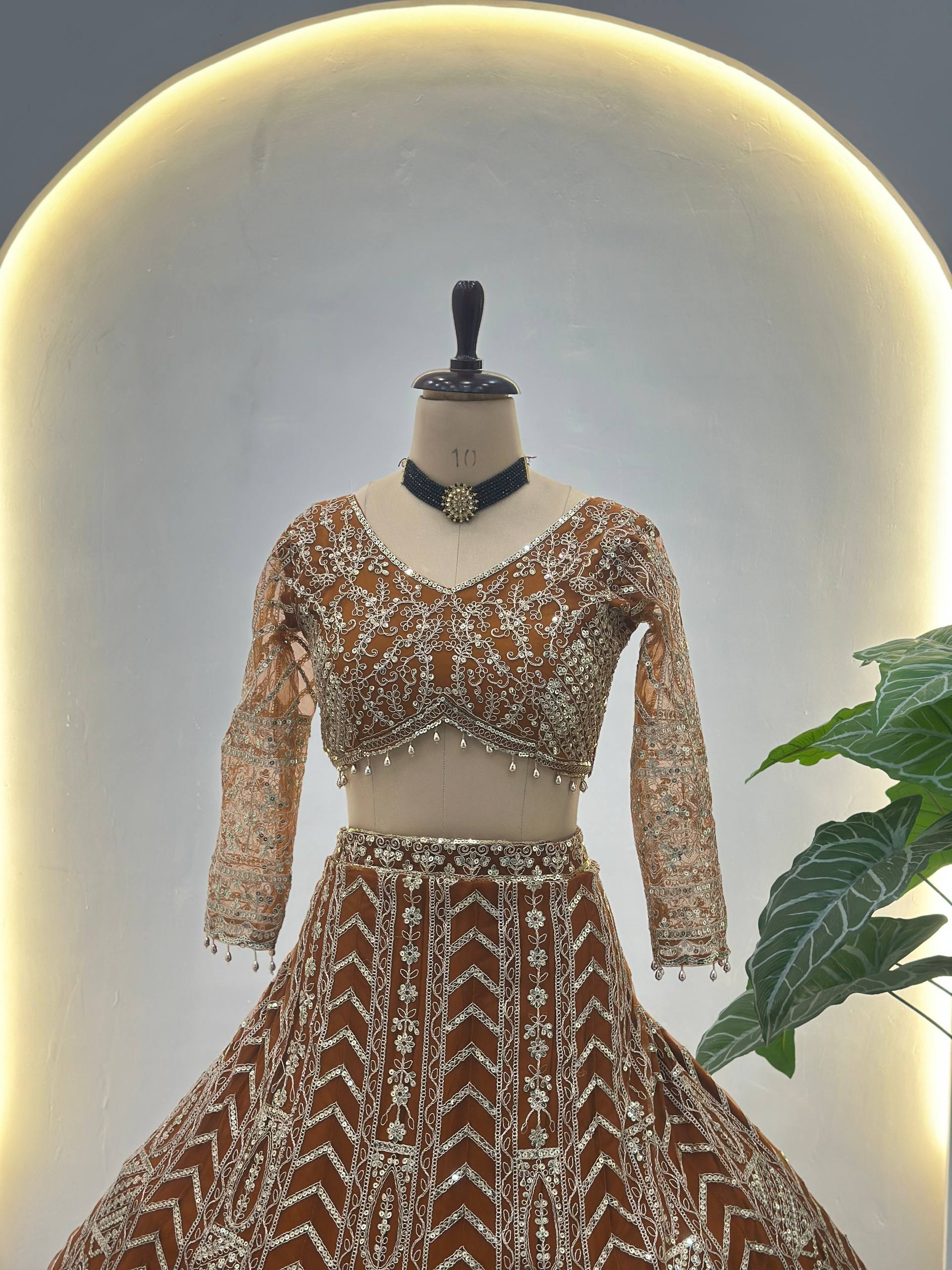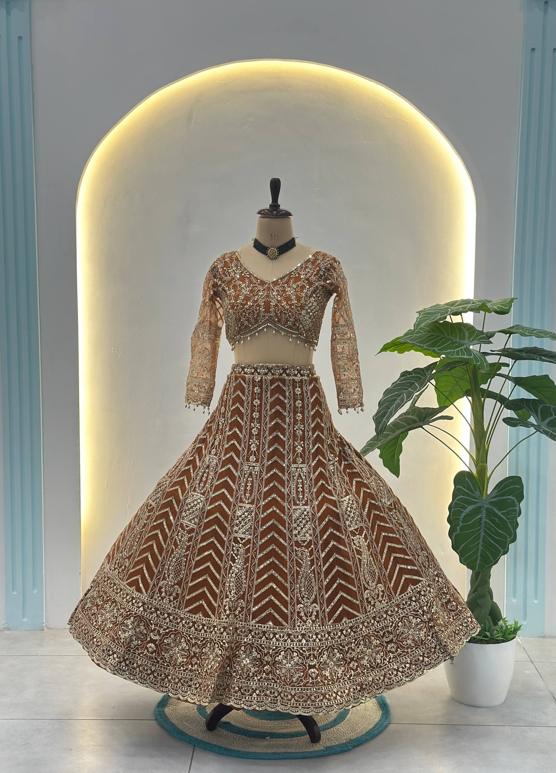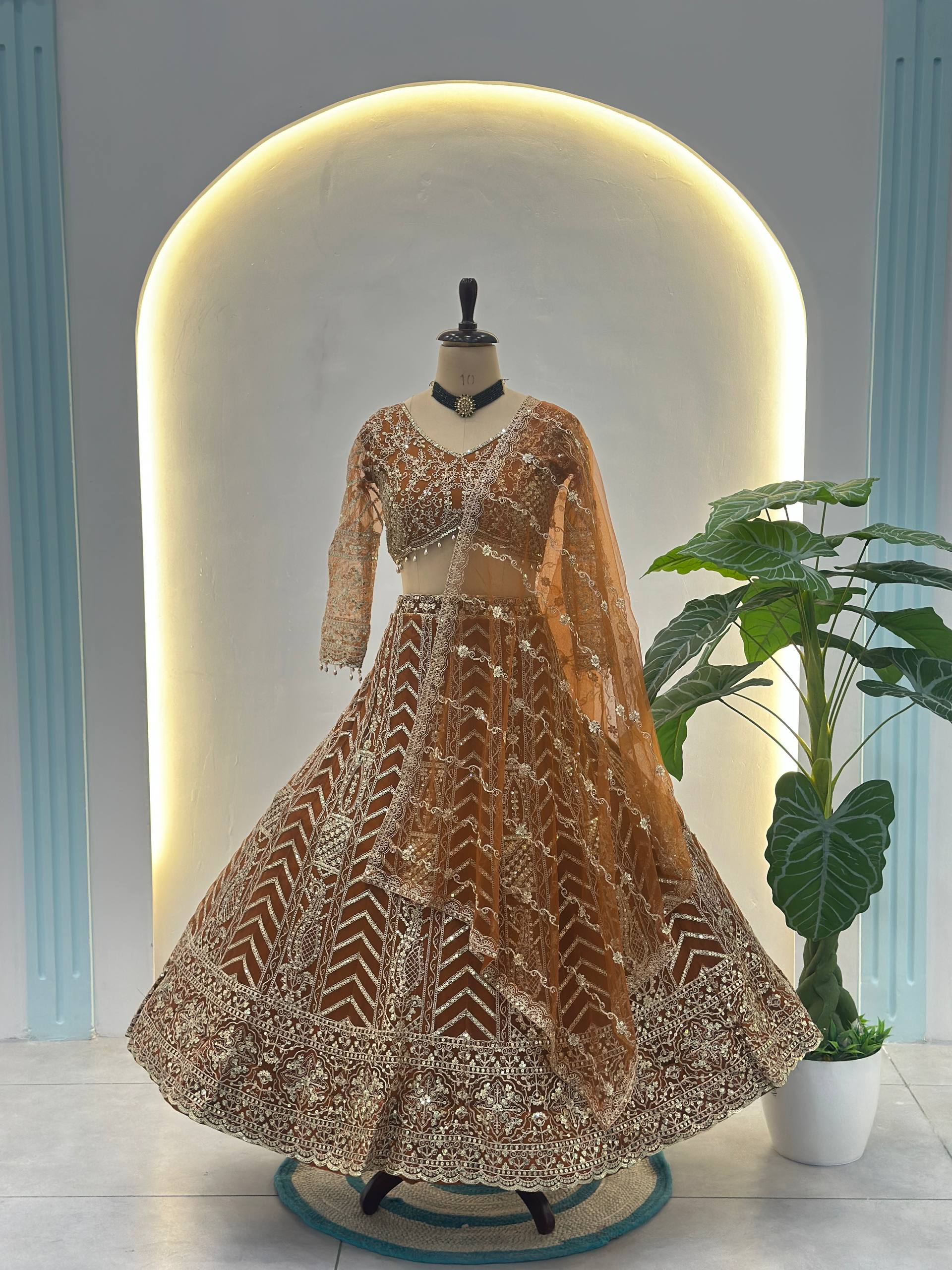 Crafted from premium butterfly net fabric, the lehenga is beautifully adorned with intricate sequins and codding embroidery work that gives a luxurious and festive sparkle. The 3-meter flair, enhanced with micro cotton inner, attached cancan and canvas, provides perfect volume and royal fall.