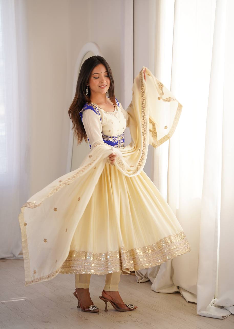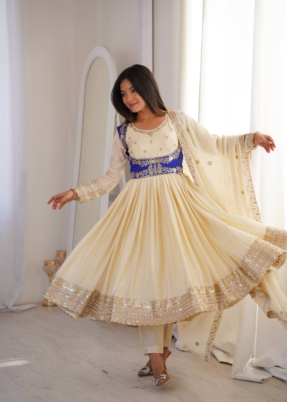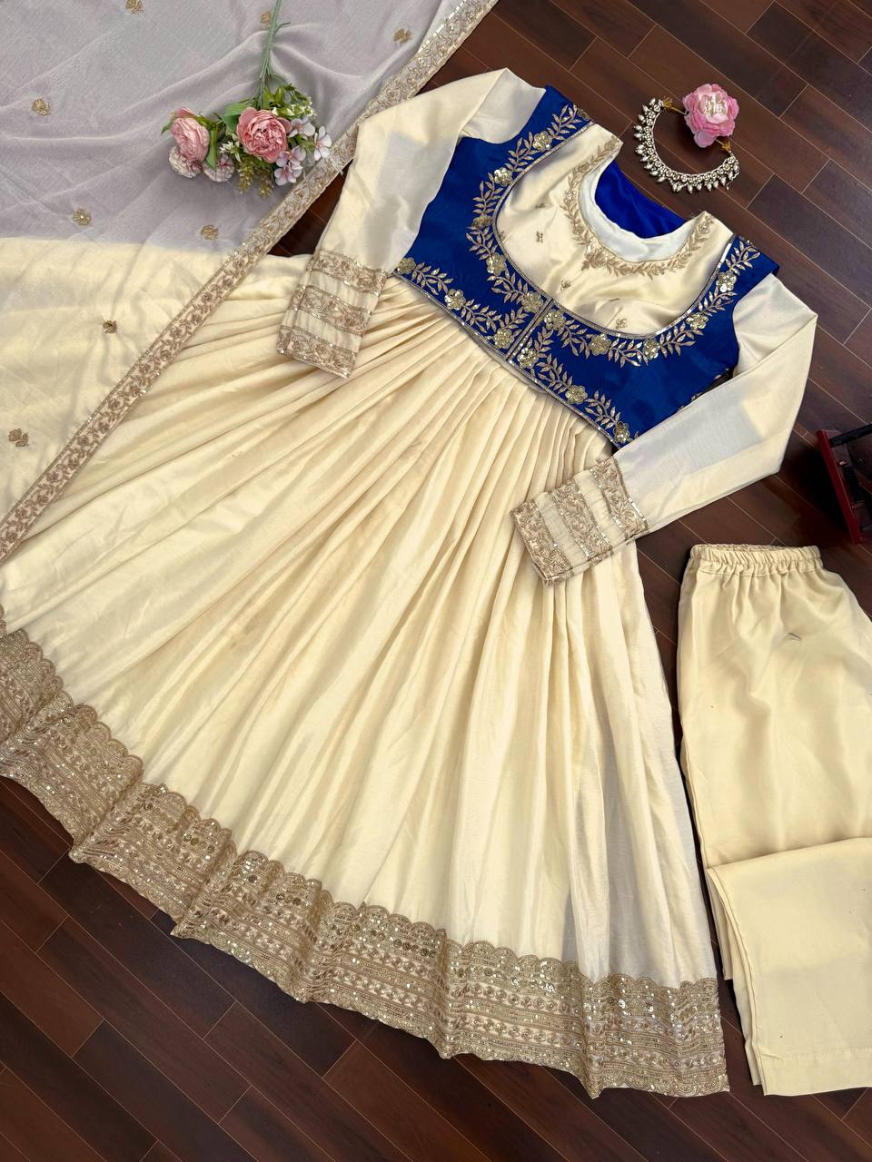Premium designer Anarkali suit set crafted in heavy chinon silk fabric with elegant thread and sequin embroidery work. This beautiful 4-piece outfit includes Anarkali, pant, koti and dupatta, giving a royal boutique look perfect for weddings, festive celebrations and special occasions.