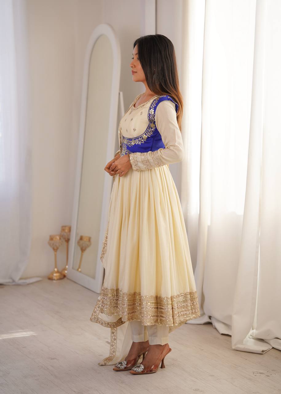 This designer outfit features a stylish Anarkali paired with comfortable pants, a beautifully embroidered koti and a matching dupatta. The soft micro inner lining ensures comfort while maintaining a graceful fall and elegant silhouette.