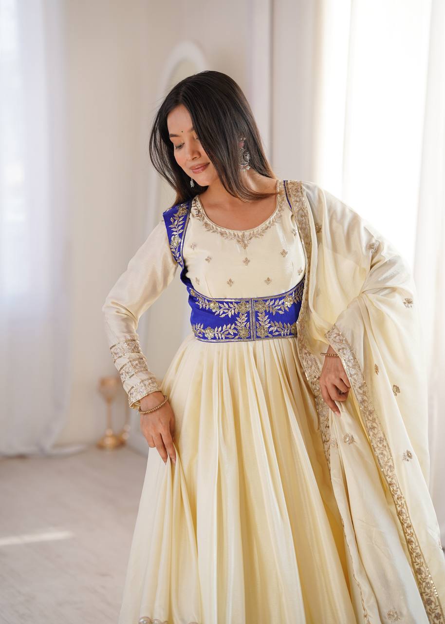 Upgrade your ethnic wardrobe with this elegant designer Anarkali suit set from RjPoshak. Crafted with premium heavy chinon silk fabric, this outfit offers a luxurious feel and stunning traditional appeal. The intricate thread and sequin embroidery work enhances the beauty of the outfit, making it a perfect choice for weddings, festive occasions and party wear.