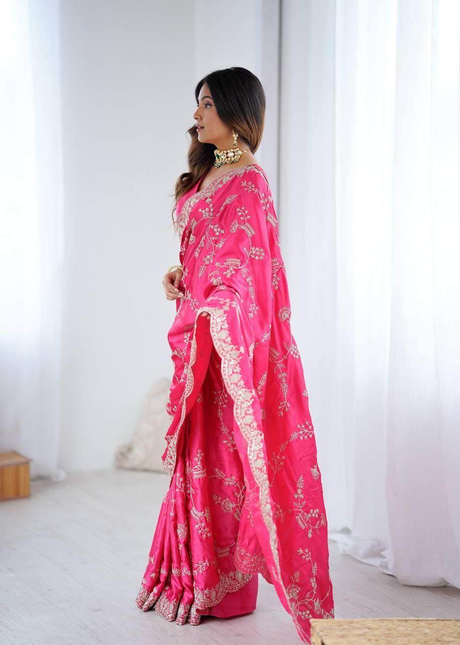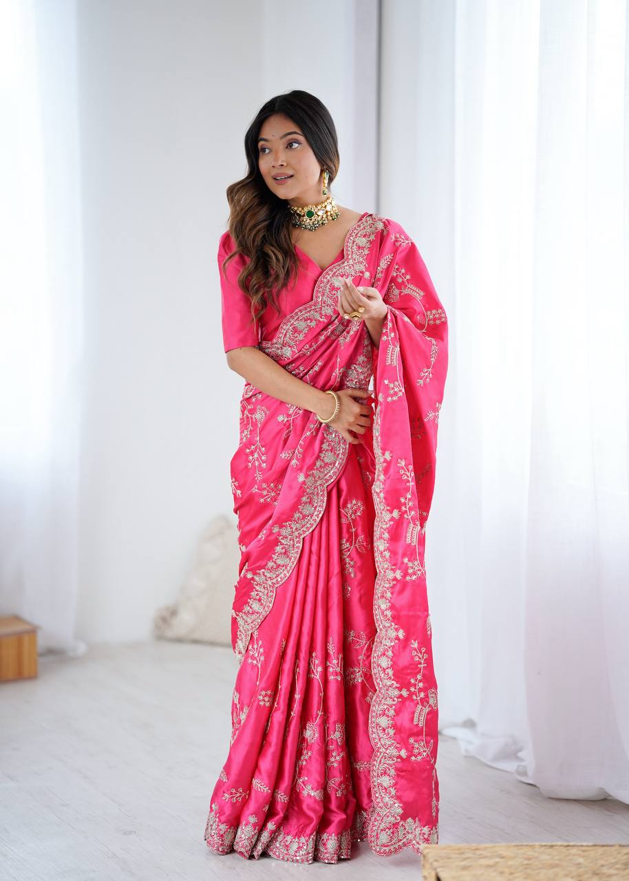 It comes with an unstitched blouse piece in matching satin silk fabric, allowing you to customize it according to your style and fit. Whether you are attending a wedding function, festive event, or party, this saree delivers a perfect blend of modern elegance and traditional charm.