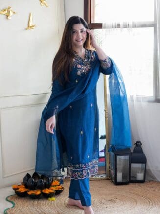The 3-piece set includes a stylish kurta, matching plazo, and a coordinated dupatta, making it a perfect choice for festive occasions, family functions, and celebrations. *Style Code*: 5981