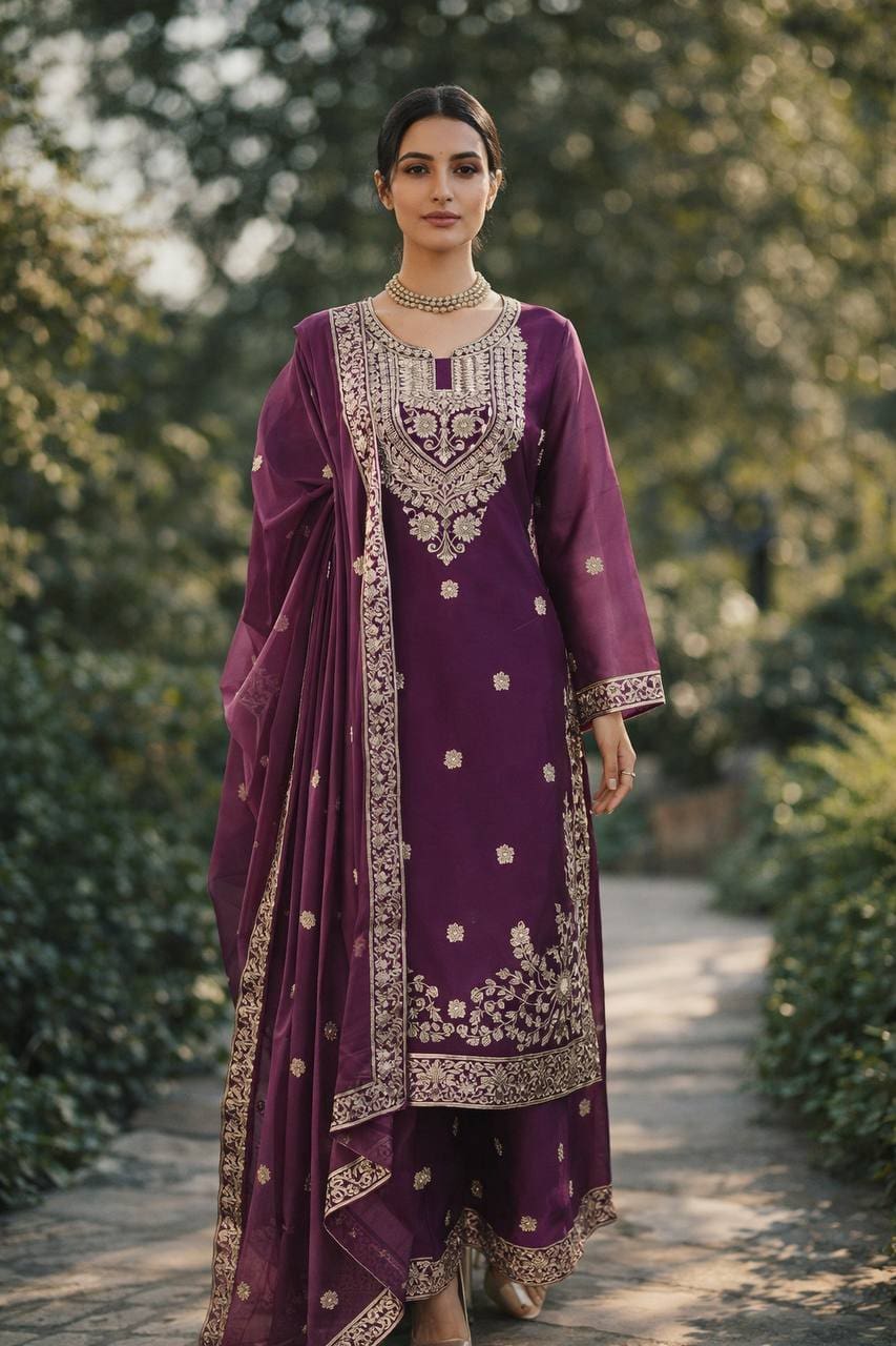 Elegant JMC silk kurta plazo set with thread work and matching dupatta. Comfortable, fully stitched festive wear outfit perfect for parties, functions, and traditional occasions. Designed by RjPoshak for a graceful and stylish look.