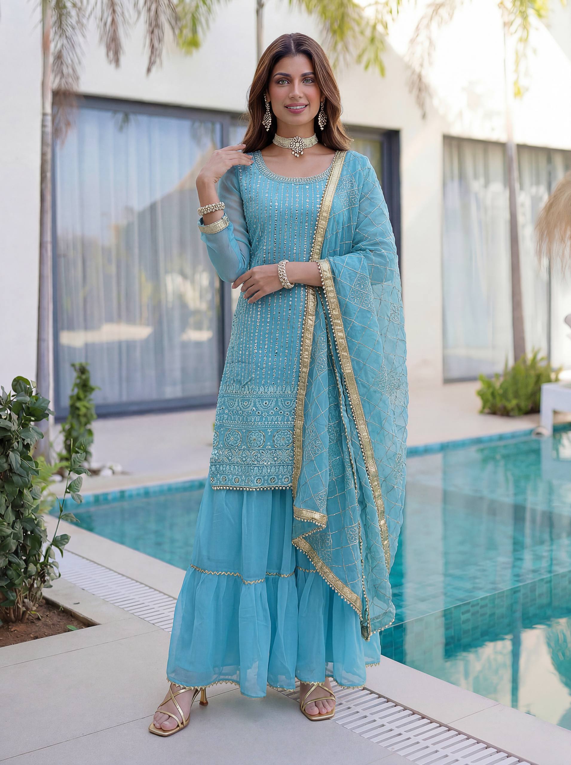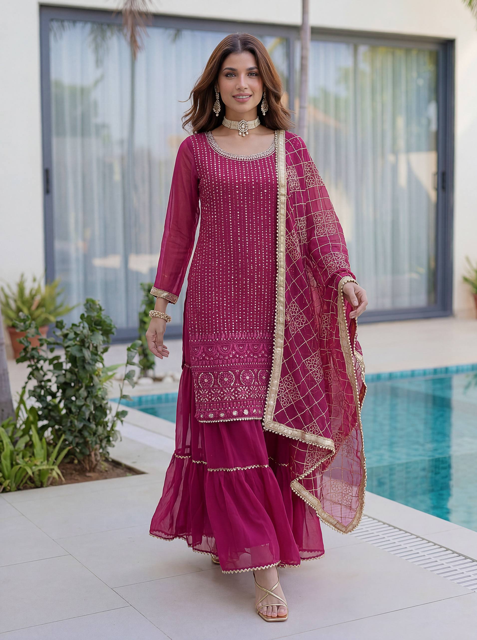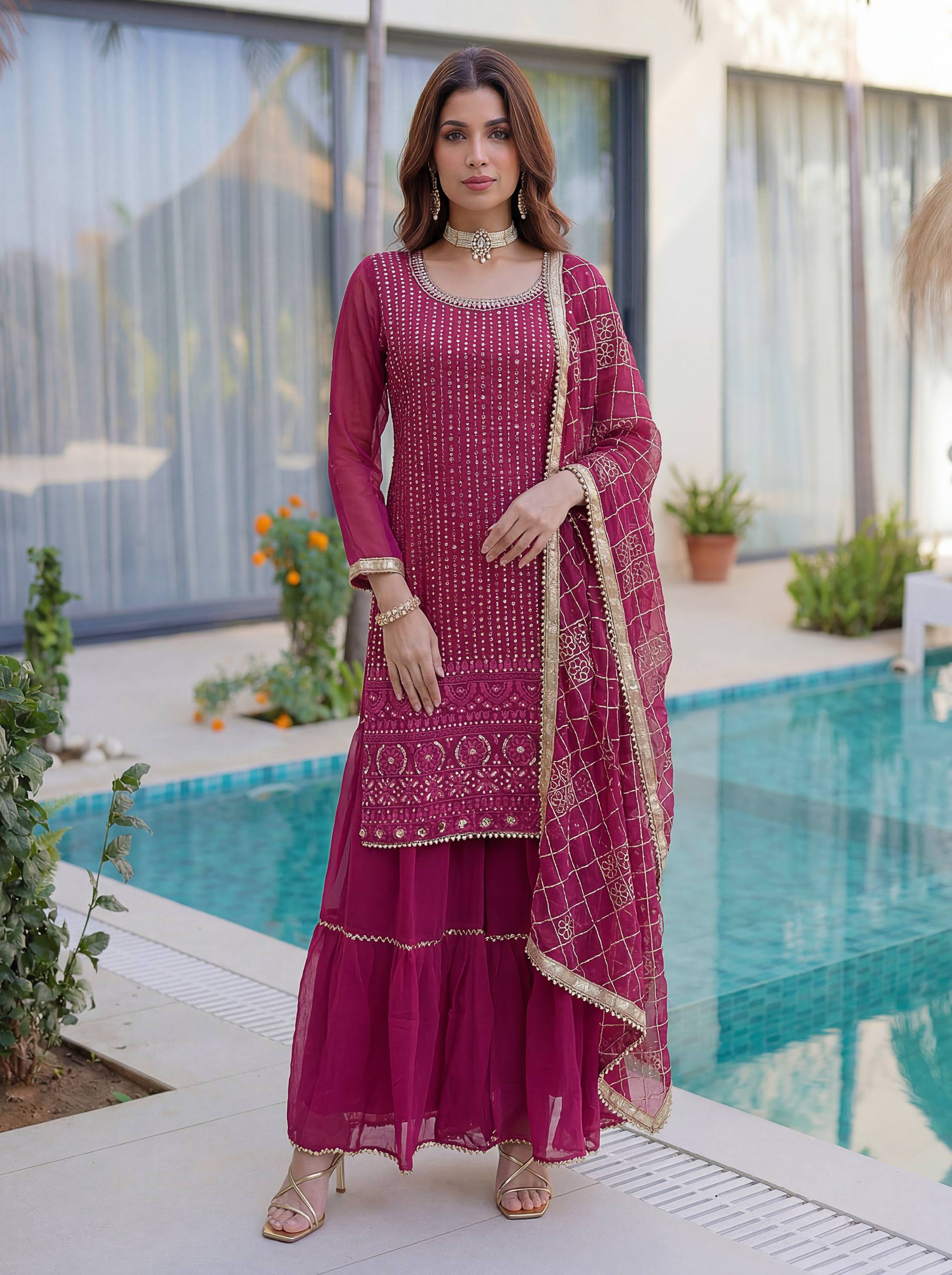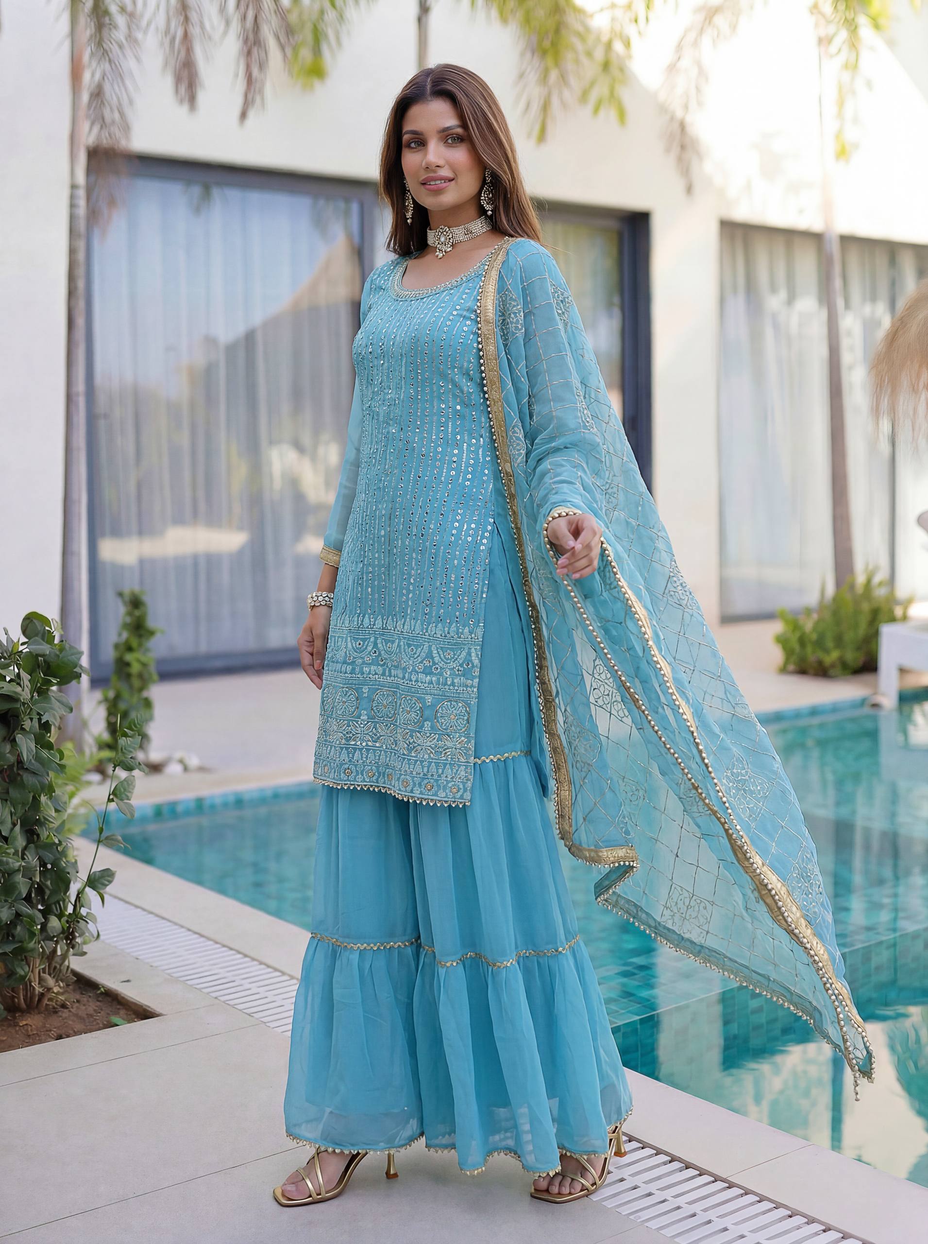 Add elegance to your festive look with this Designer Kurti Sharara Set from RjPoshak. Crafted in faux georgette with embroidery, sequence and zari work, perfect for weddings, parties and festive occasions.