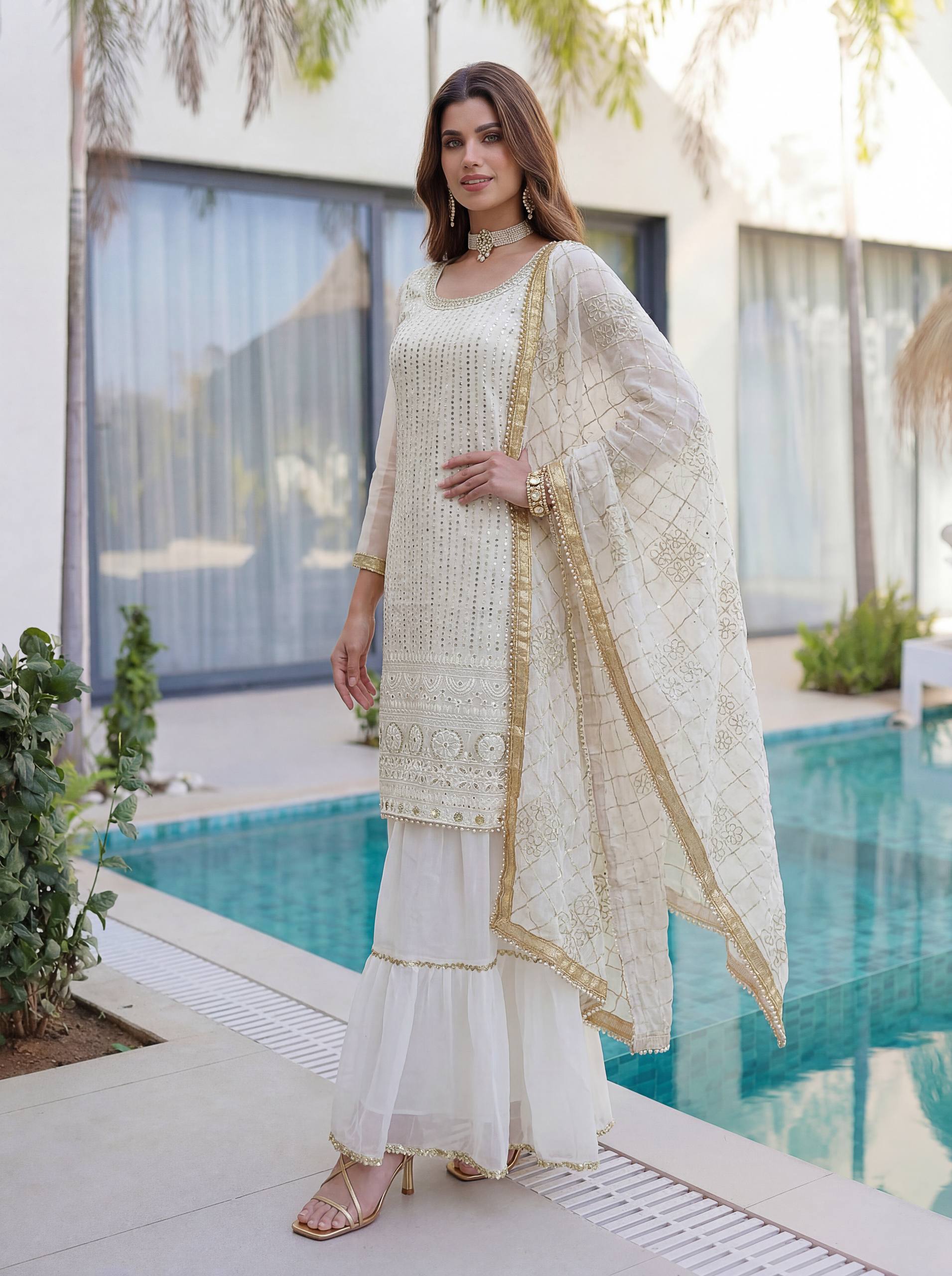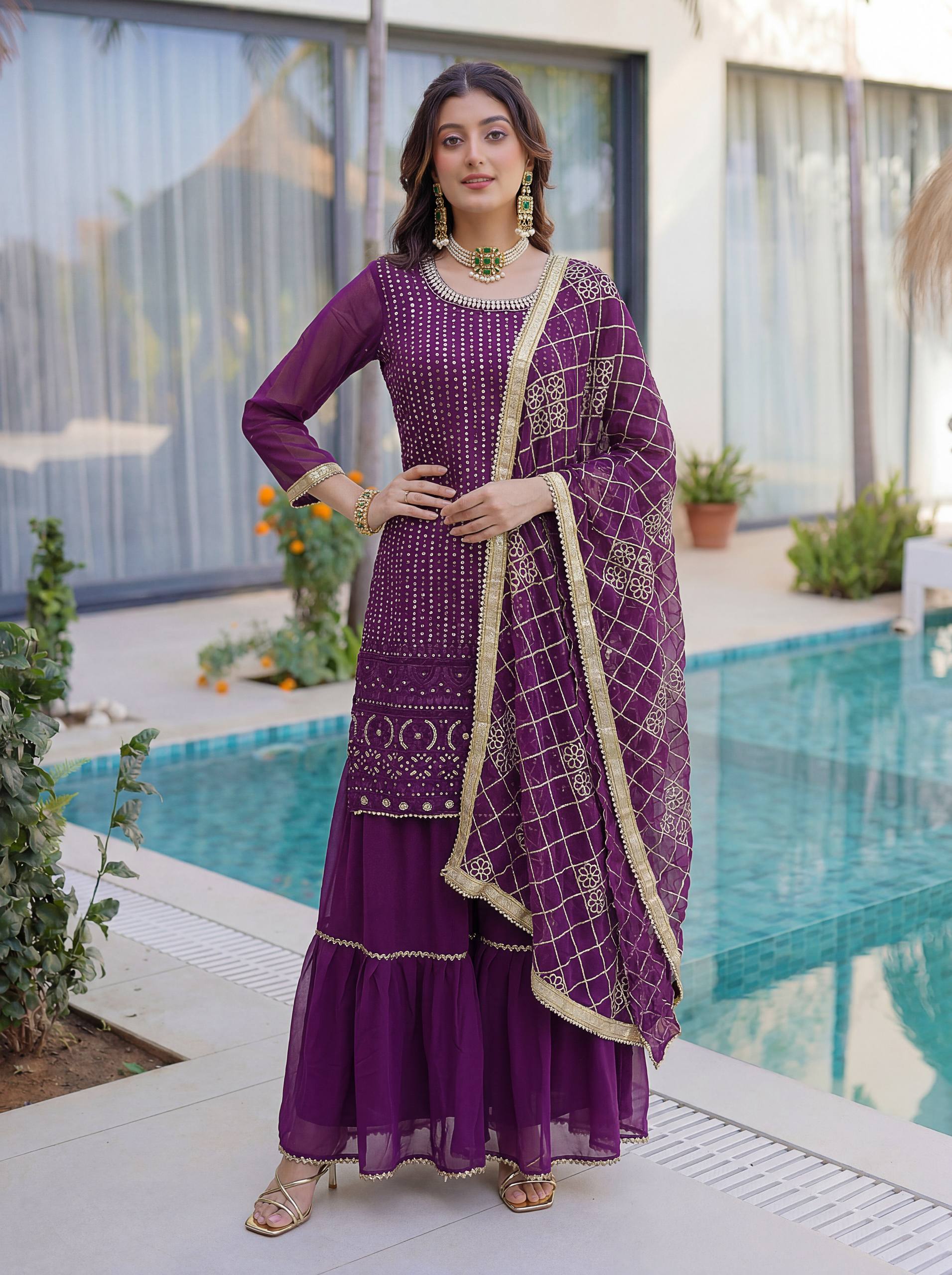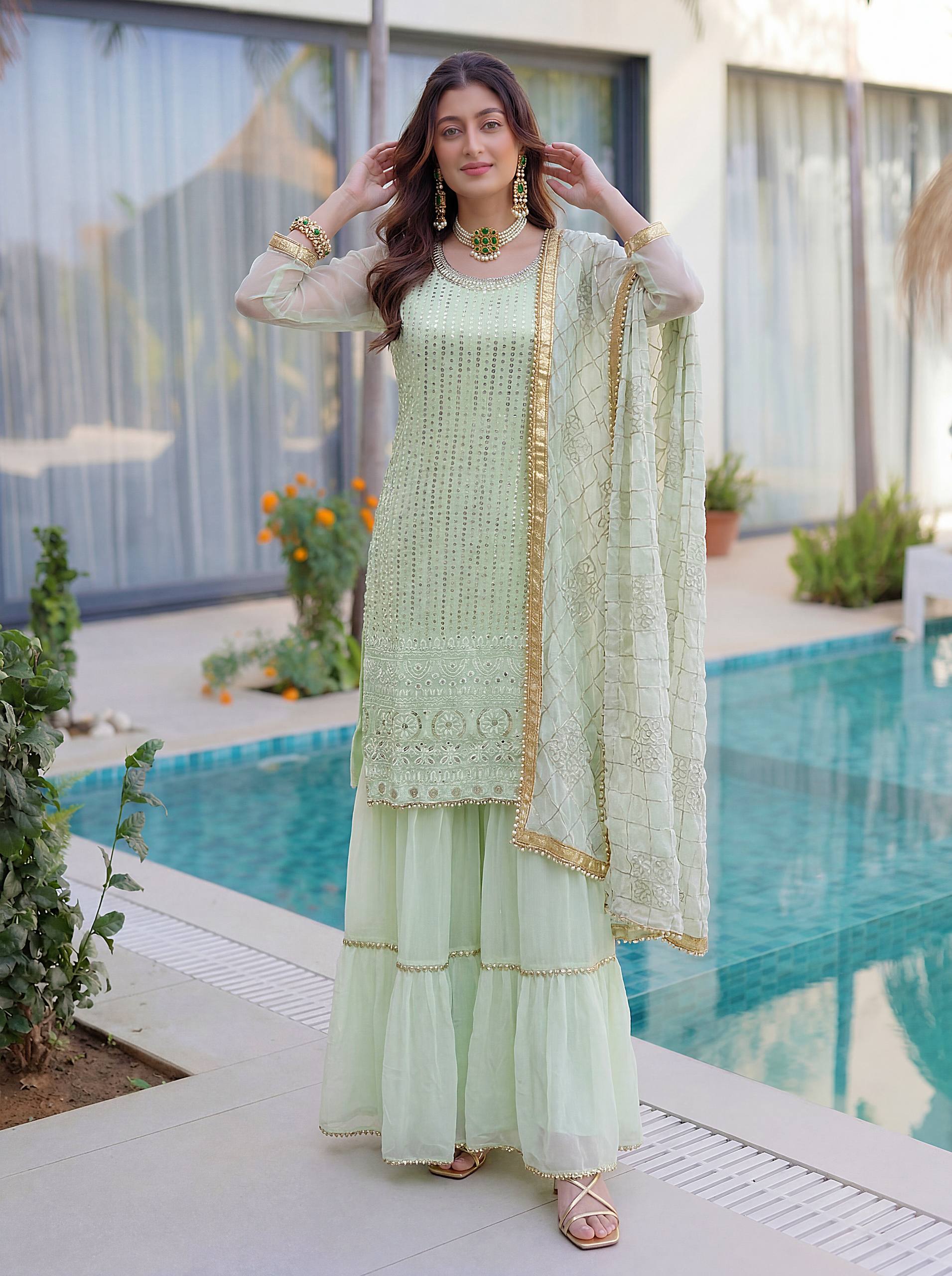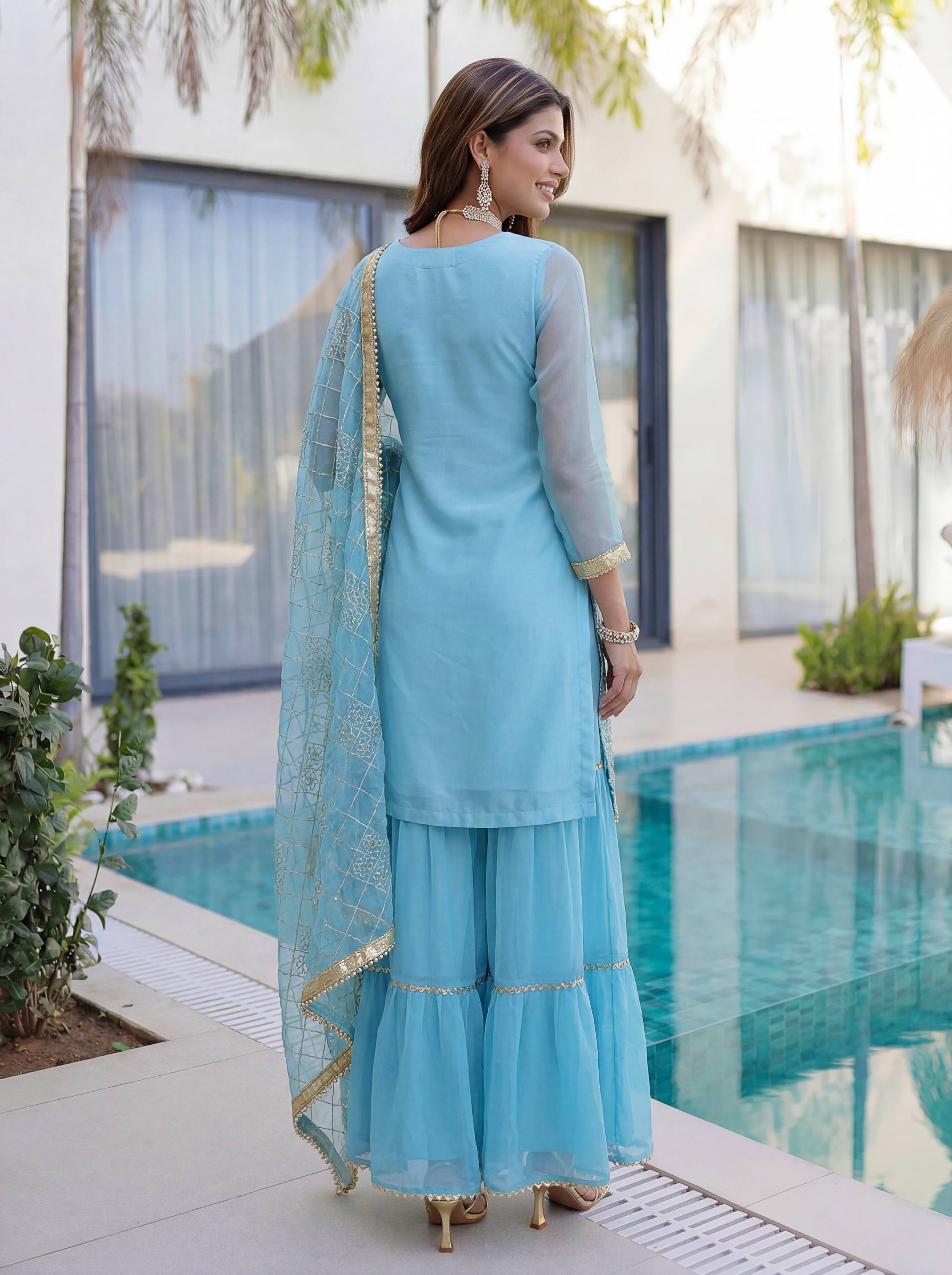 Add elegance to your festive look with this Designer Kurti Sharara Set from RjPoshak. Crafted in faux georgette with embroidery, sequence and zari work, perfect for weddings, parties and festive occasions.