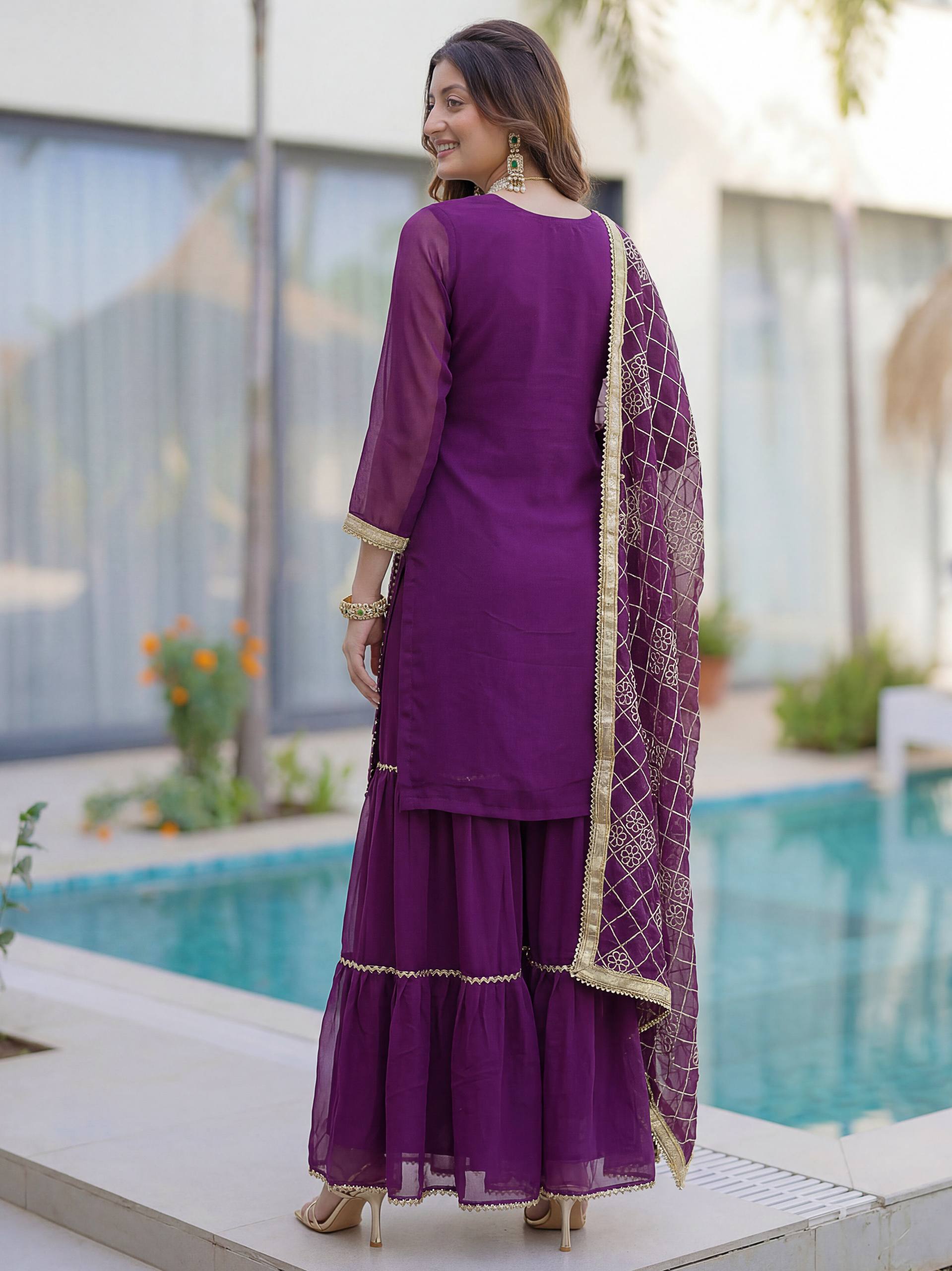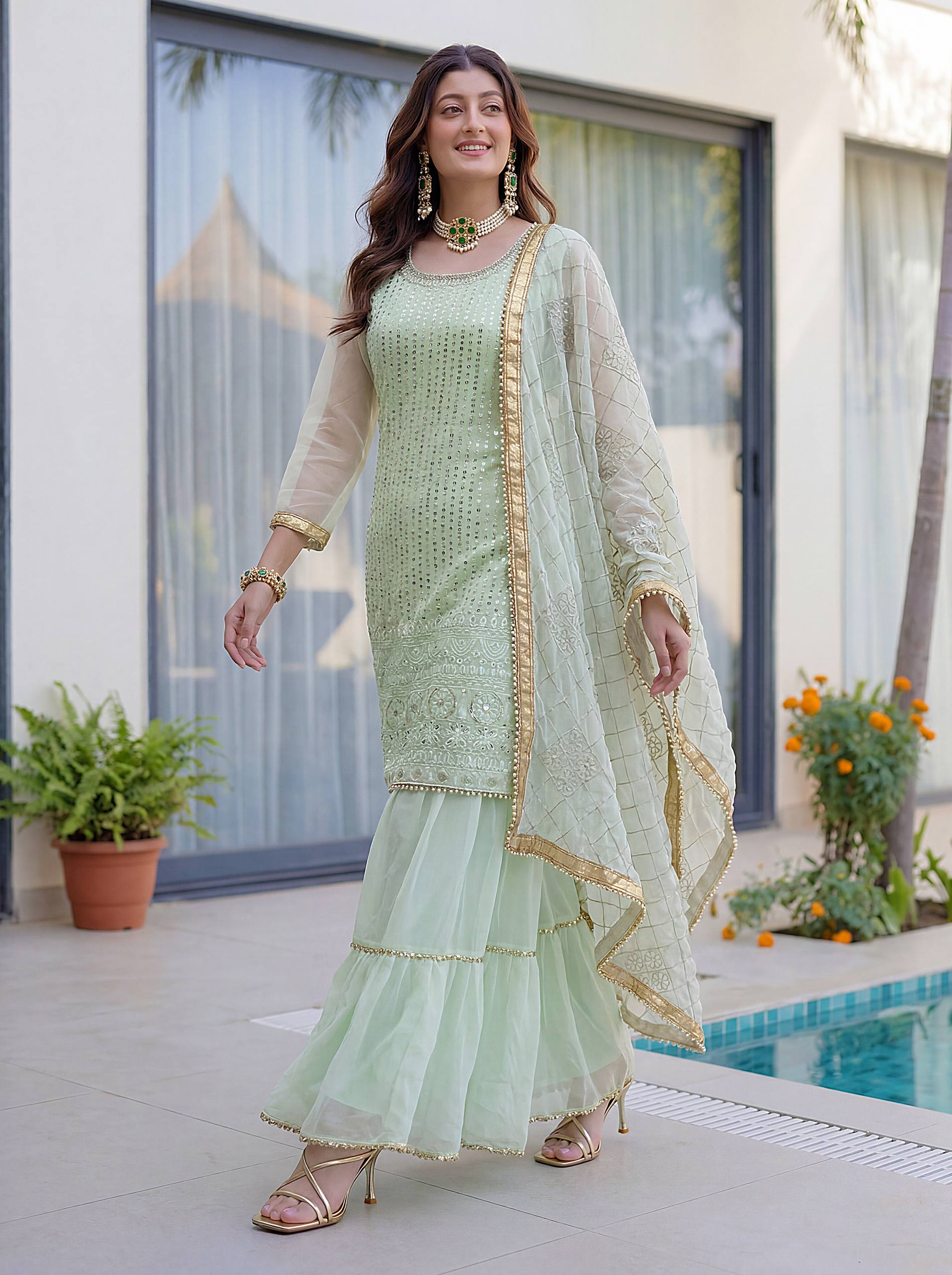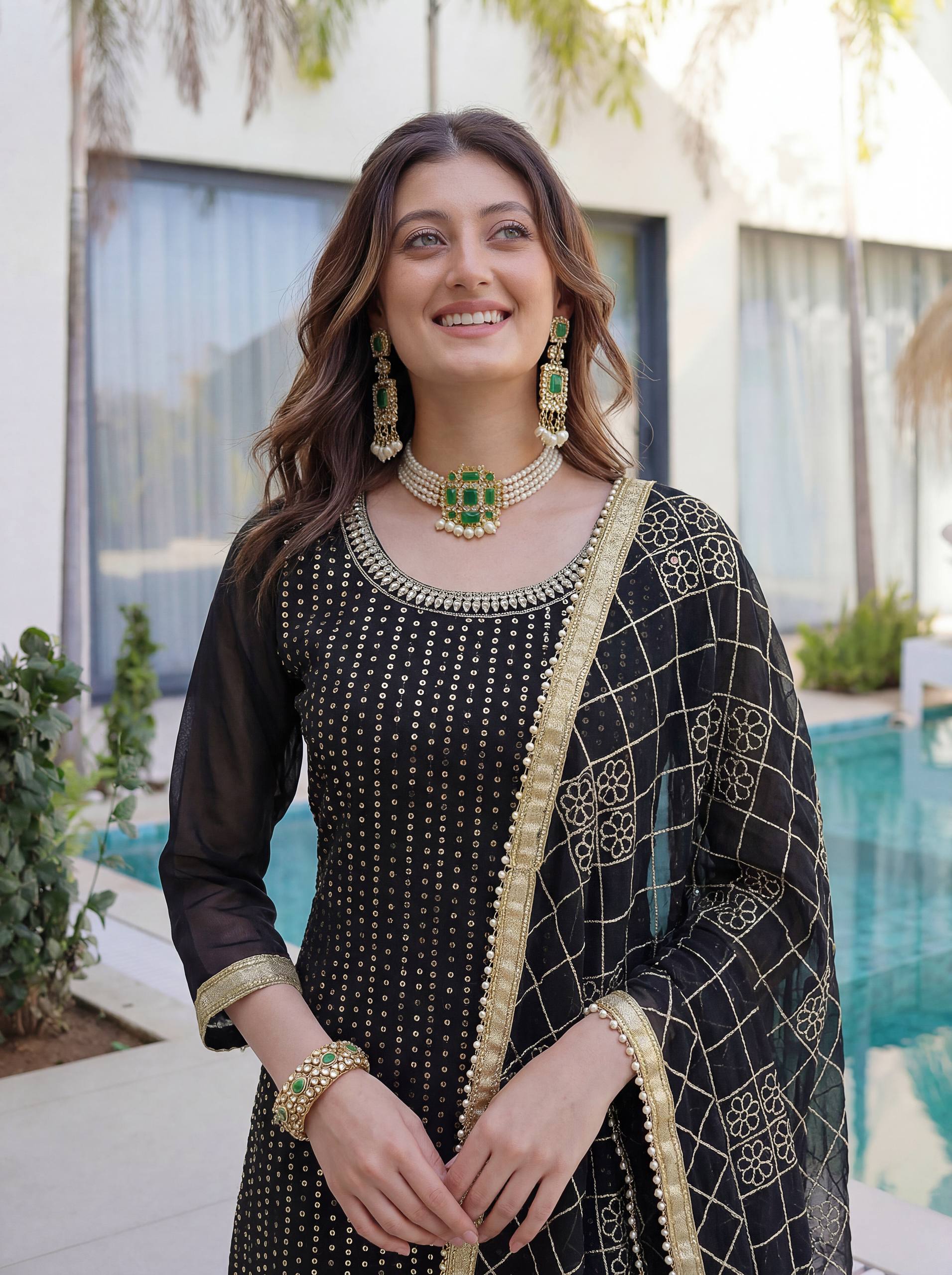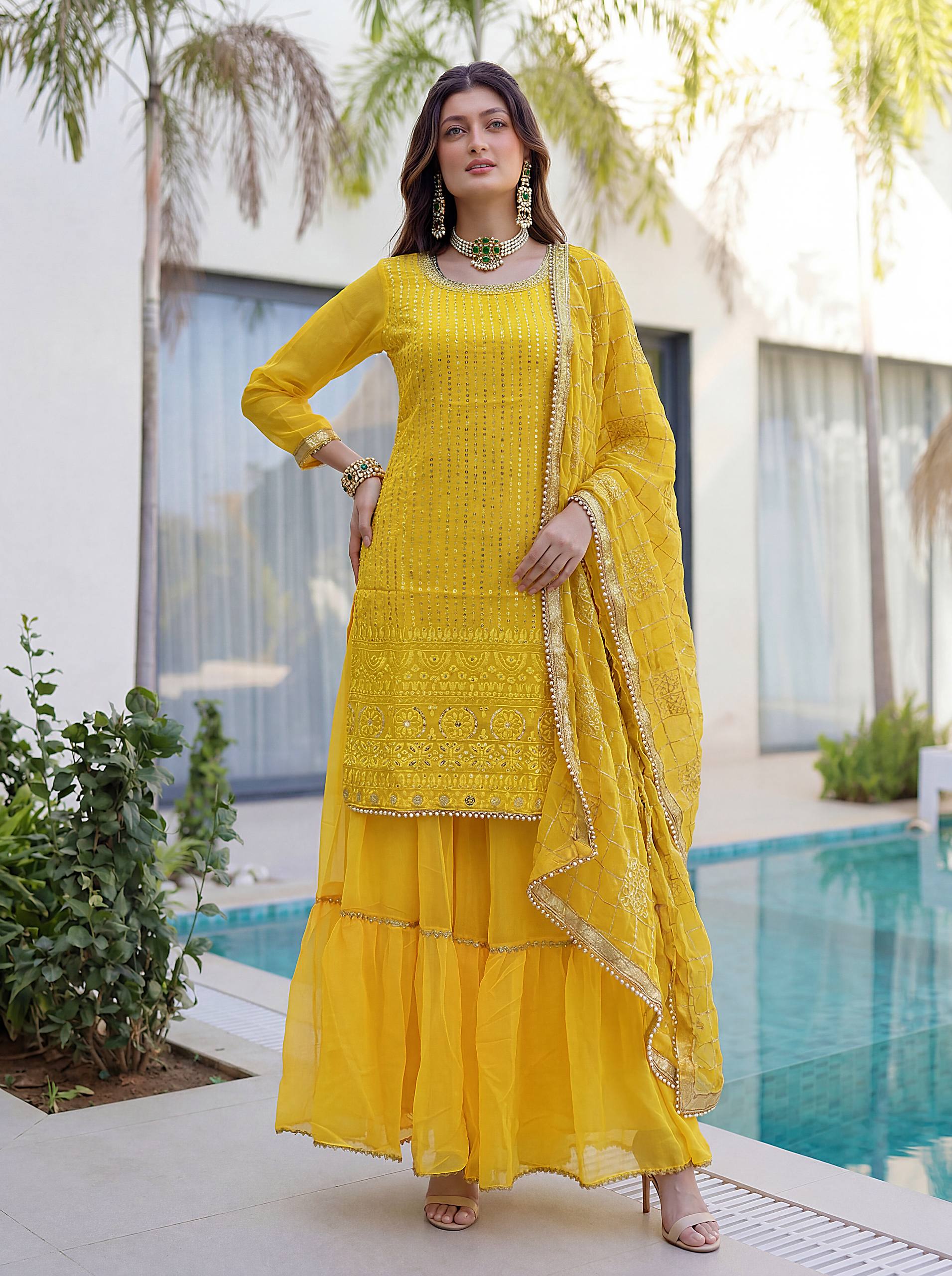 Add elegance to your festive look with this Designer Kurti Sharara Set from RjPoshak. Crafted in faux georgette with embroidery, sequence and zari work, perfect for weddings, parties and festive occasions.