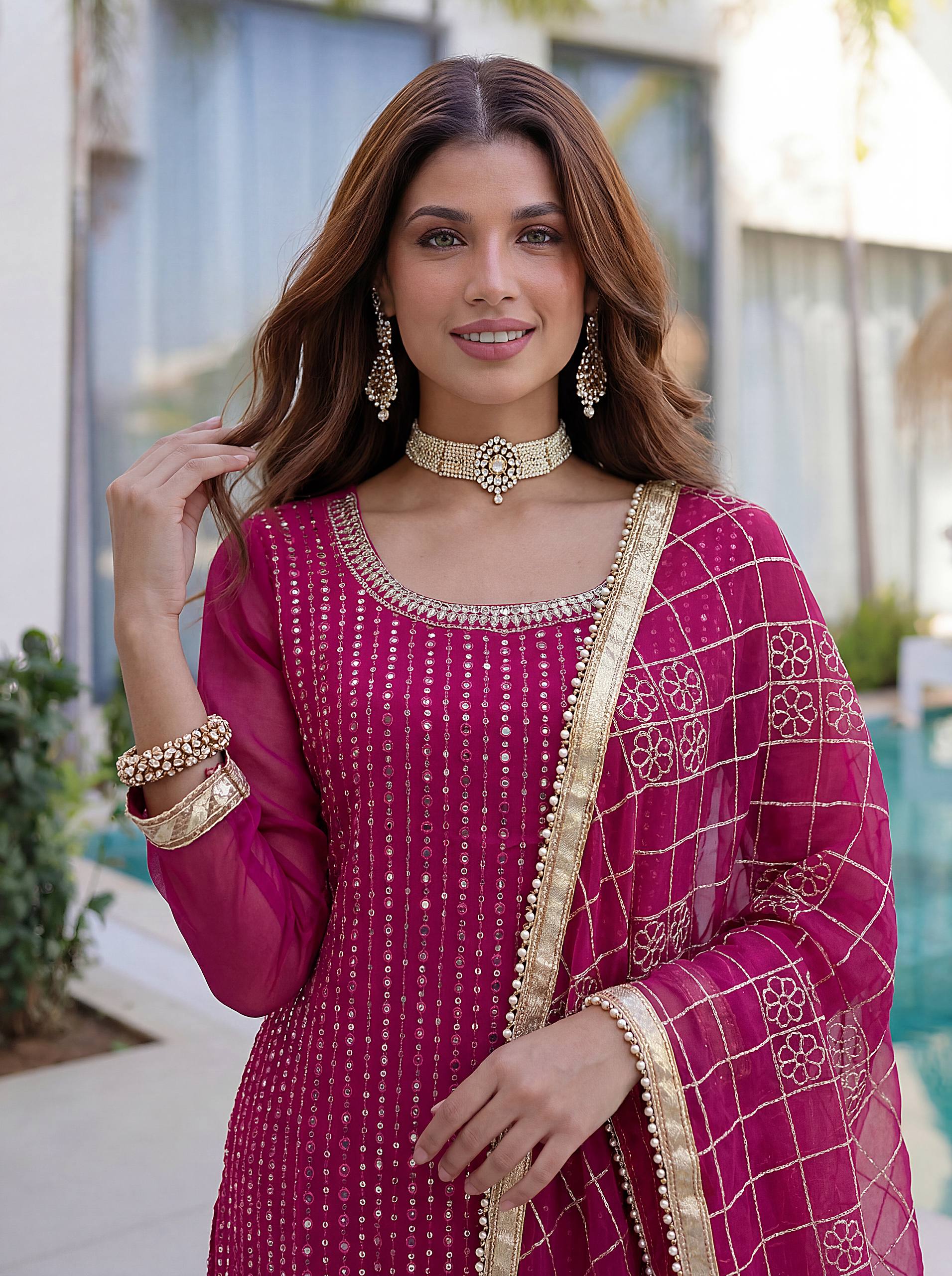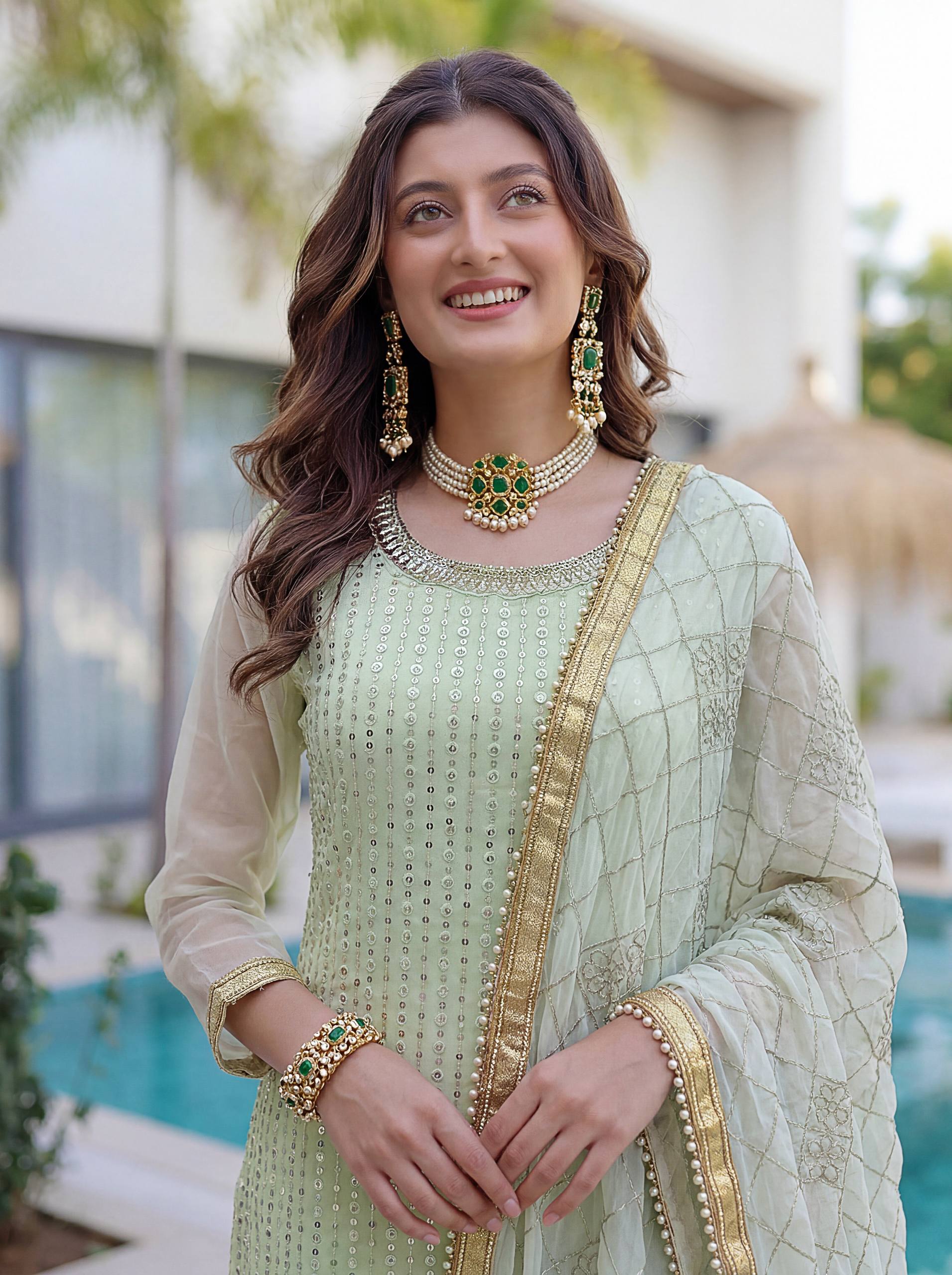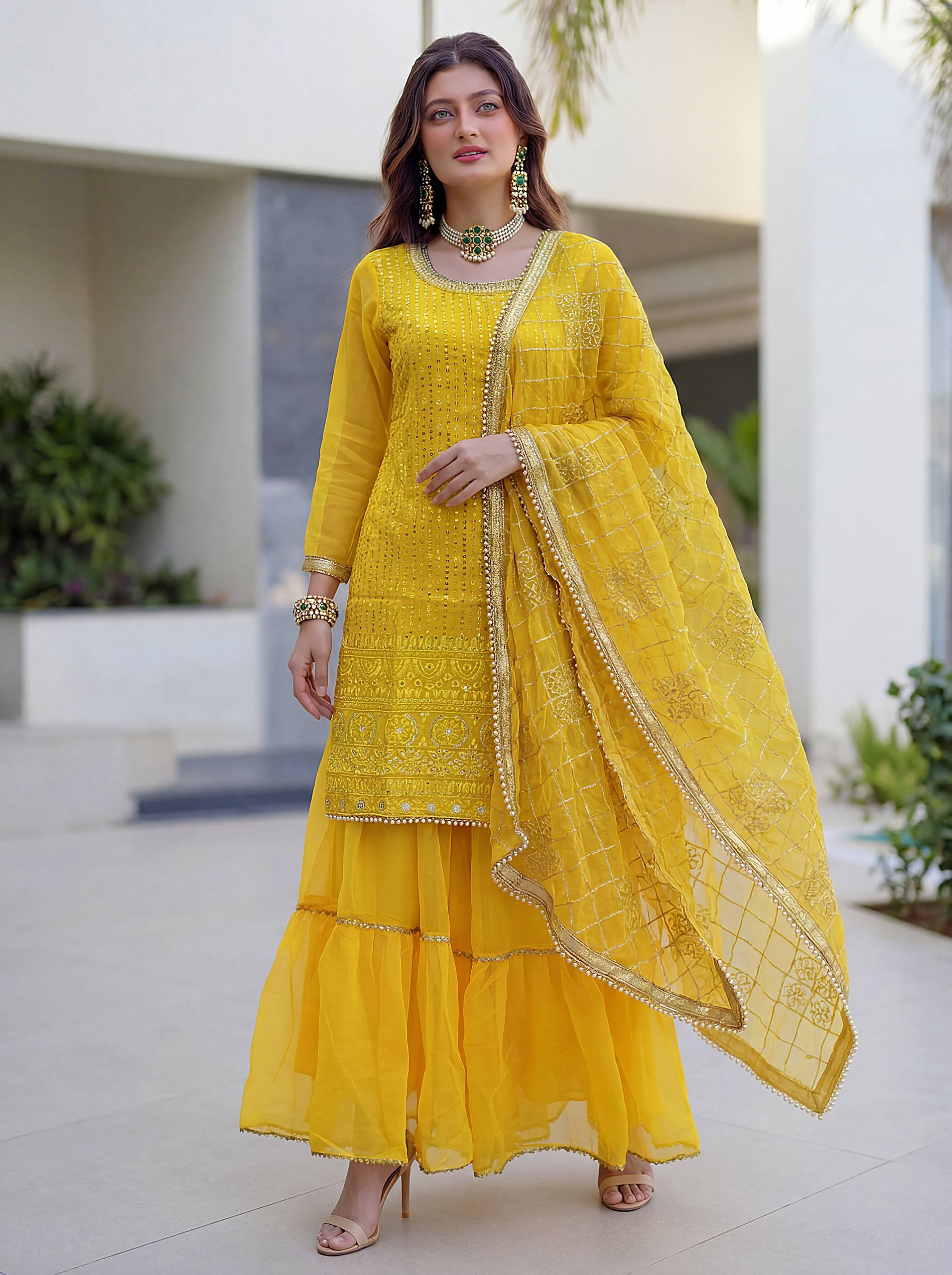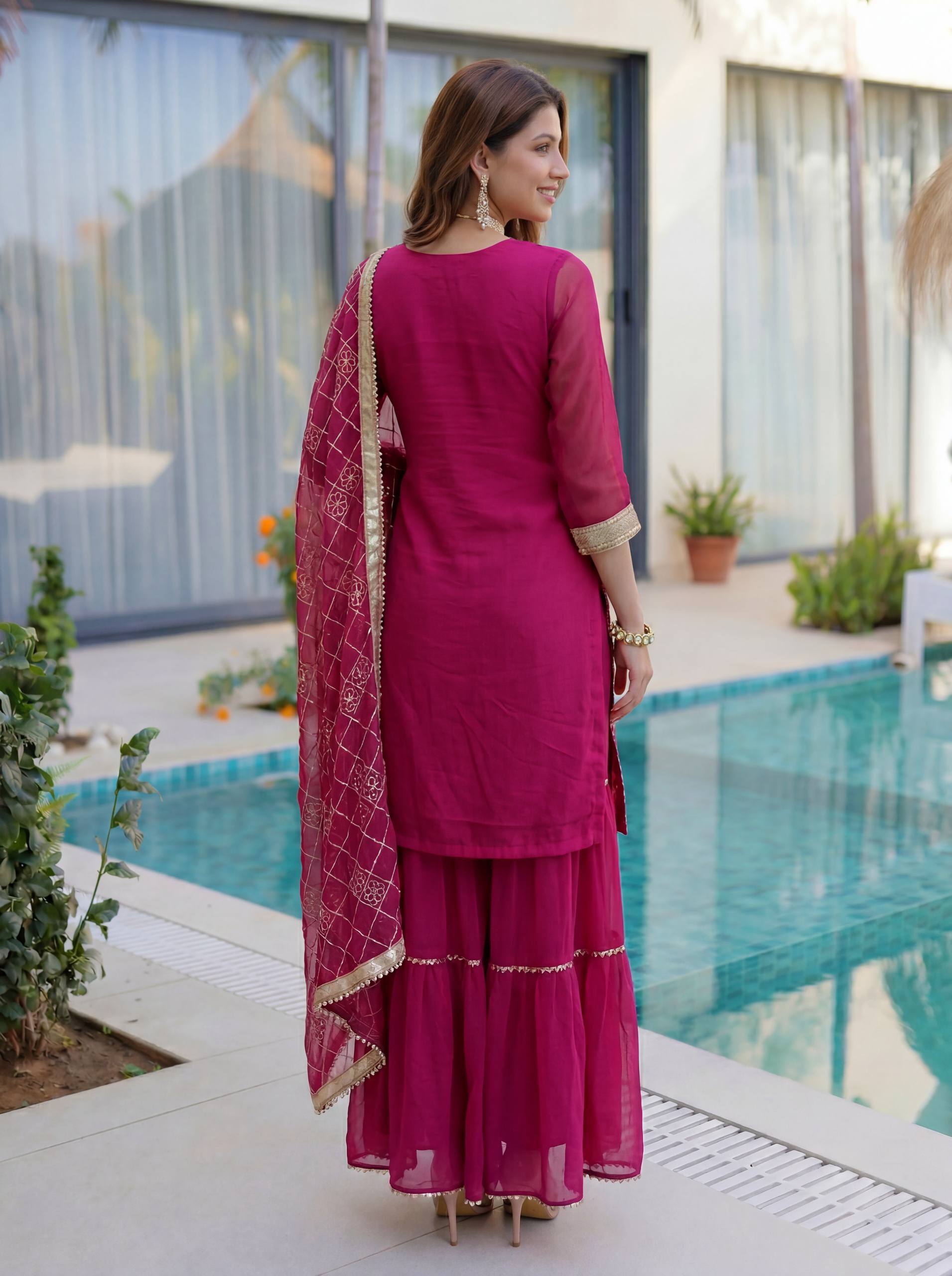 Add elegance to your festive look with this Designer Kurti Sharara Set from RjPoshak. Crafted in faux georgette with embroidery, sequence and zari work, perfect for weddings, parties and festive occasions.