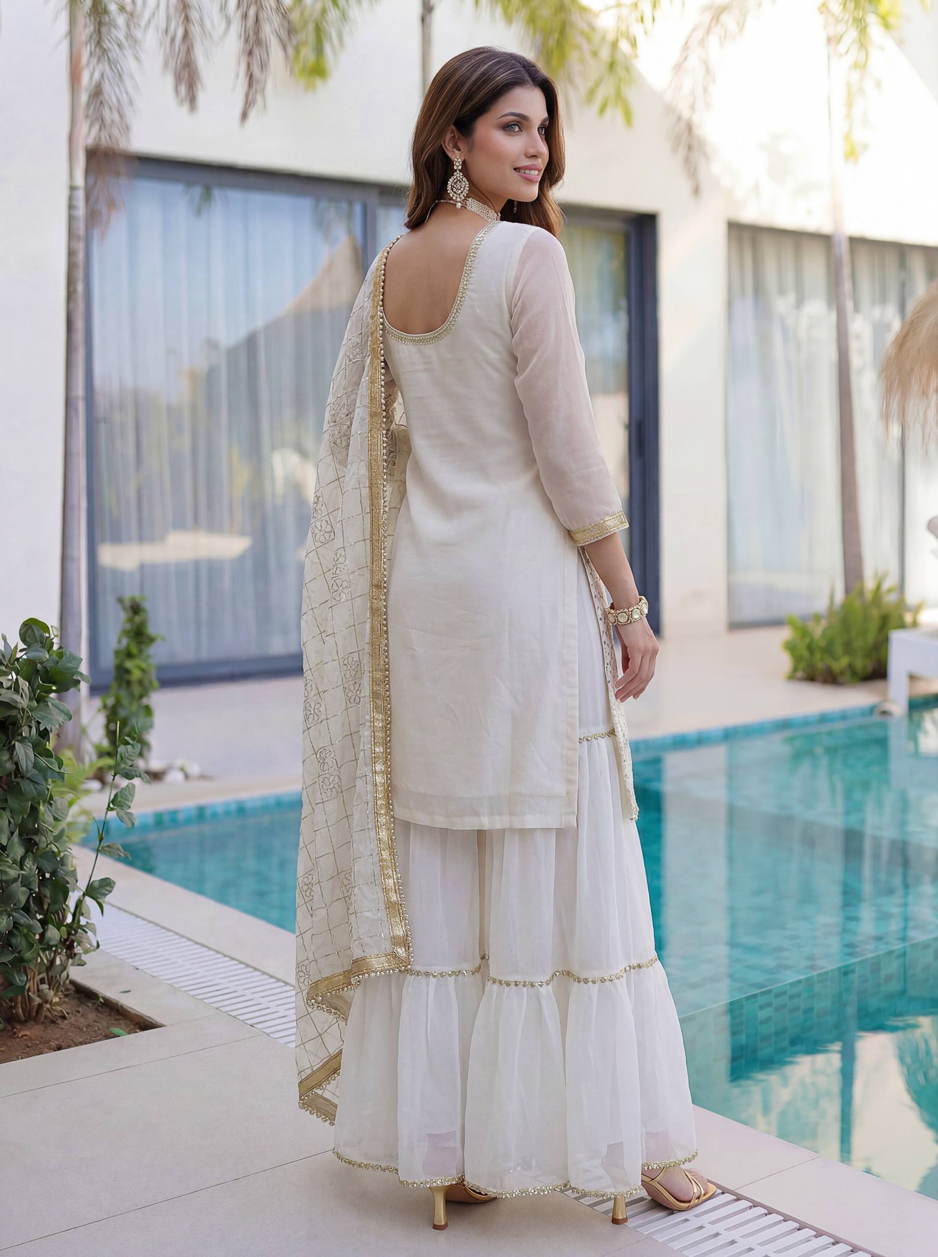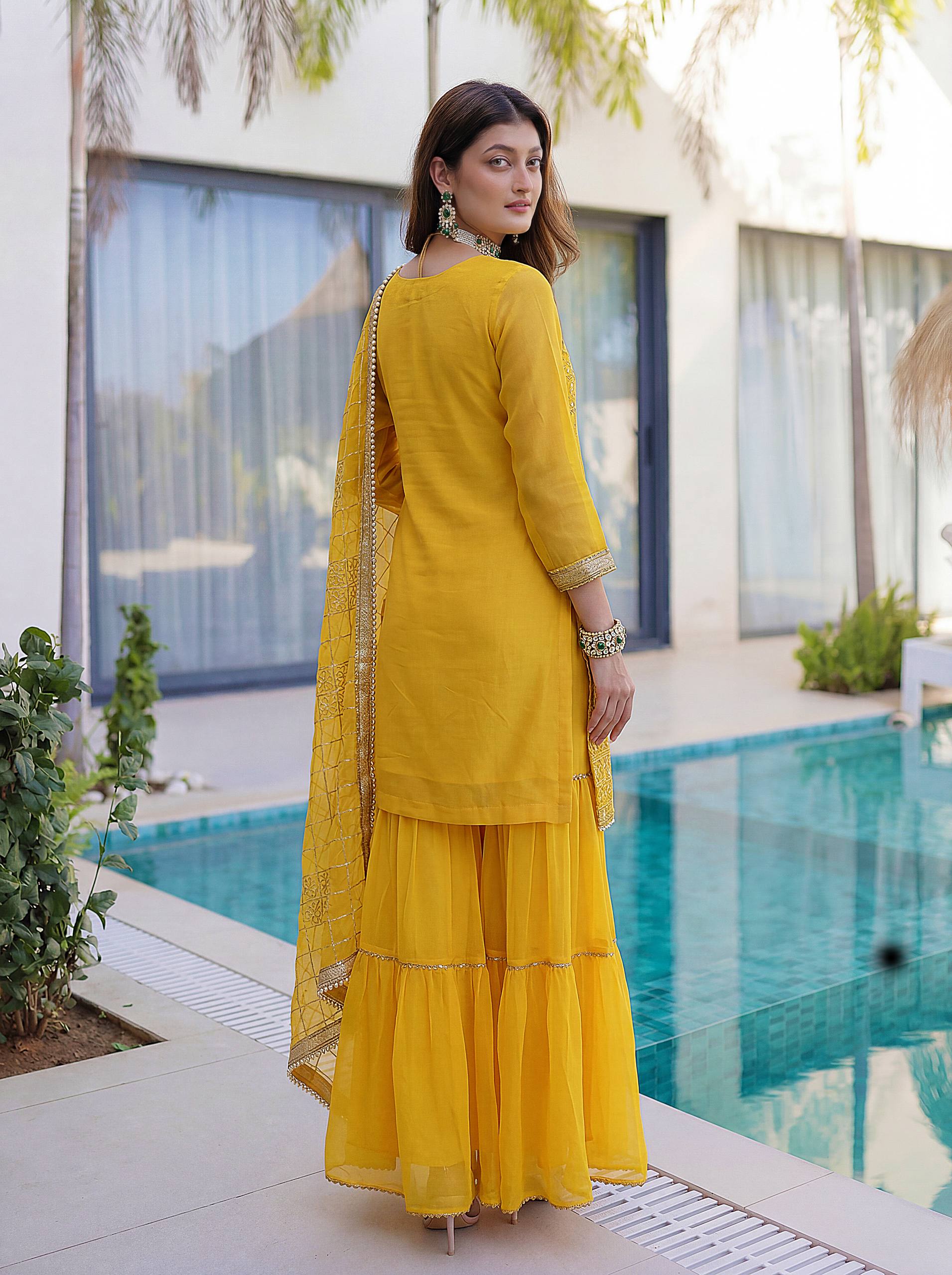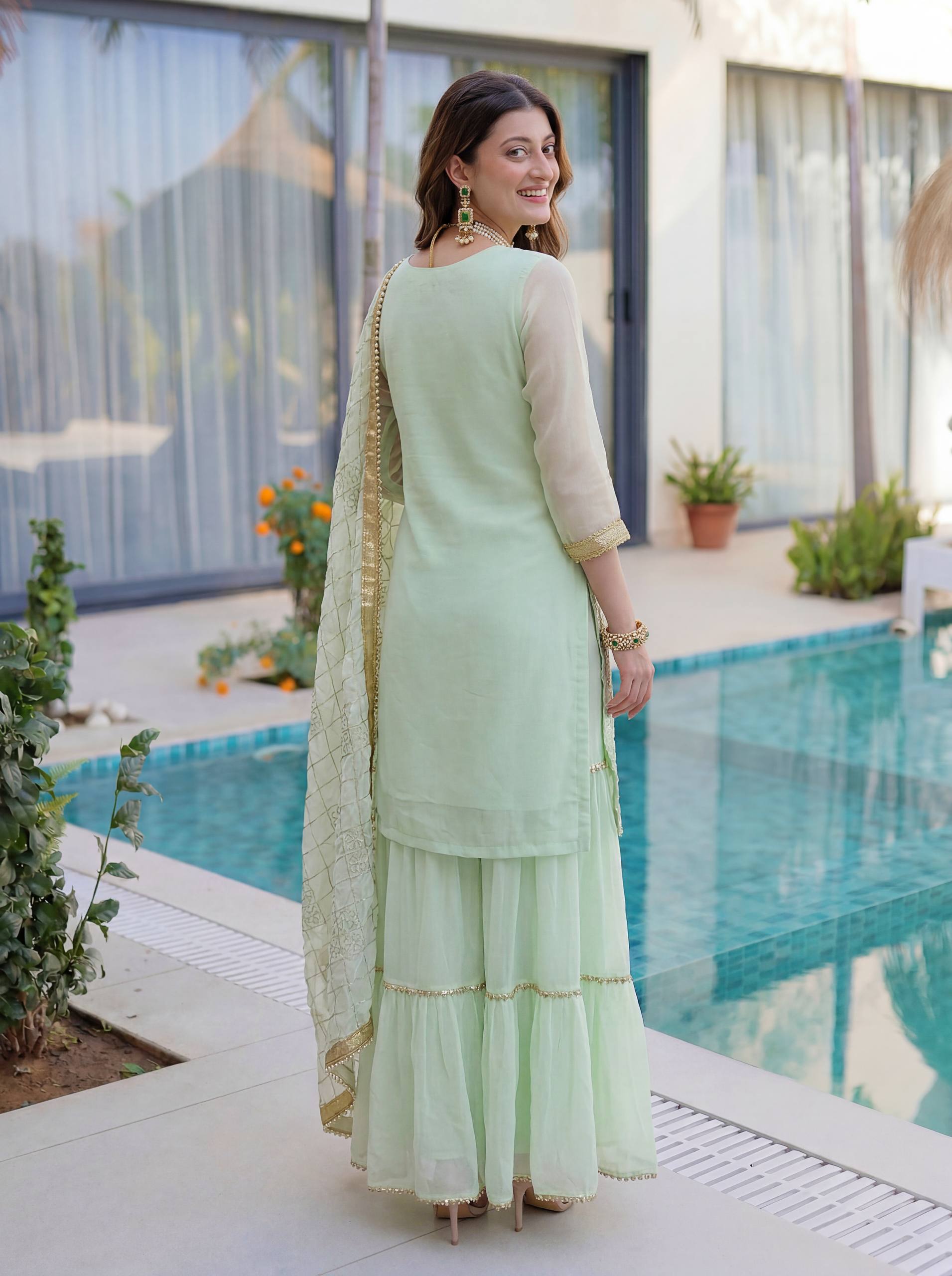 Paired with a fully stitched sharara featuring a stylish lace border, this set creates a flowy and elegant silhouette. The matching dupatta with embroidery design work completes the ensemble, adding a refined ethnic charm.