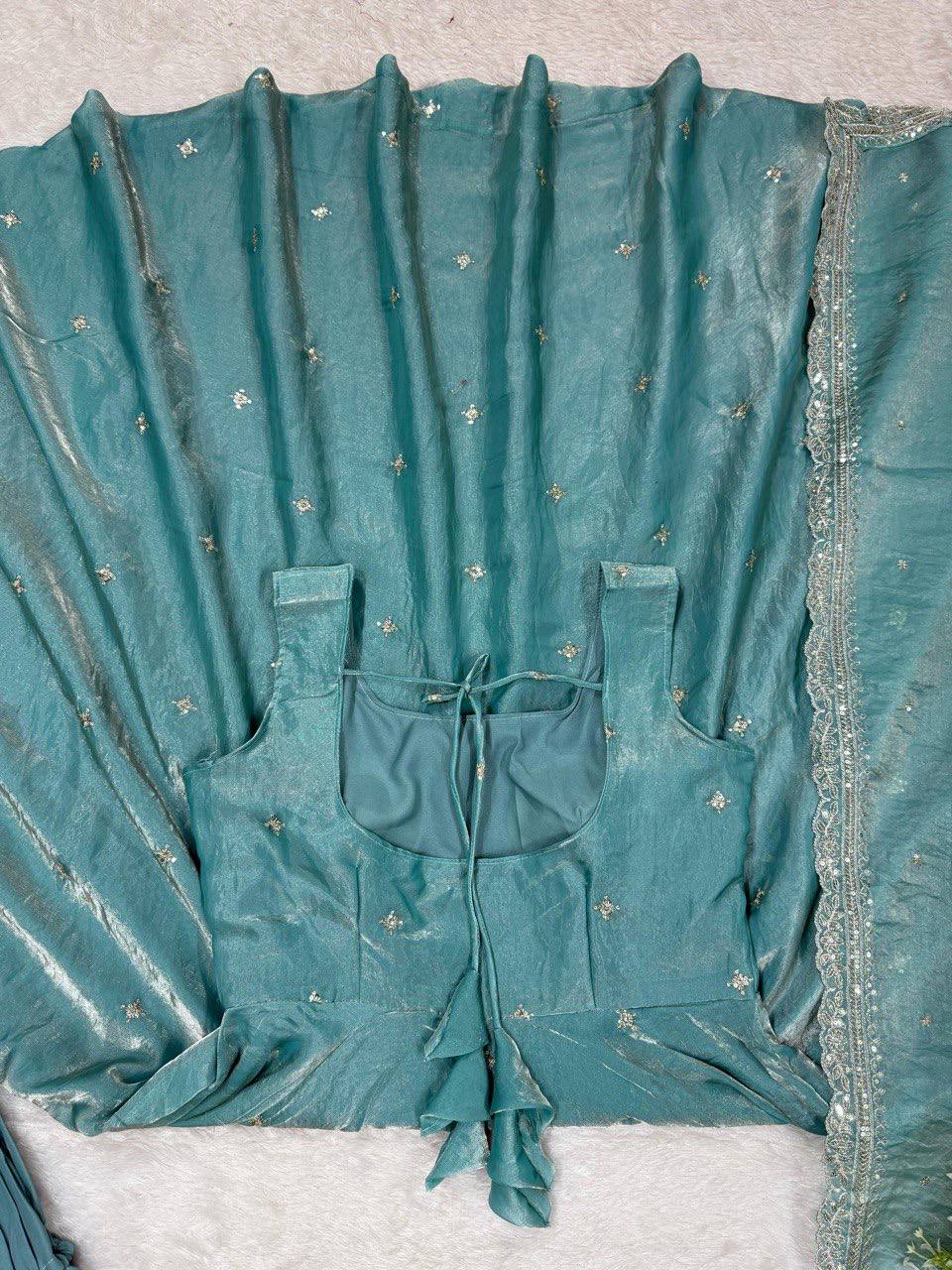 Step into festive elegance with this Designer Gown Set from RjPoshak, specially crafted for Eid and special occasions. Made from premium Fendy Silk fabric and detailed with intricate thread and sequins work, this outfit gives a rich and graceful look.