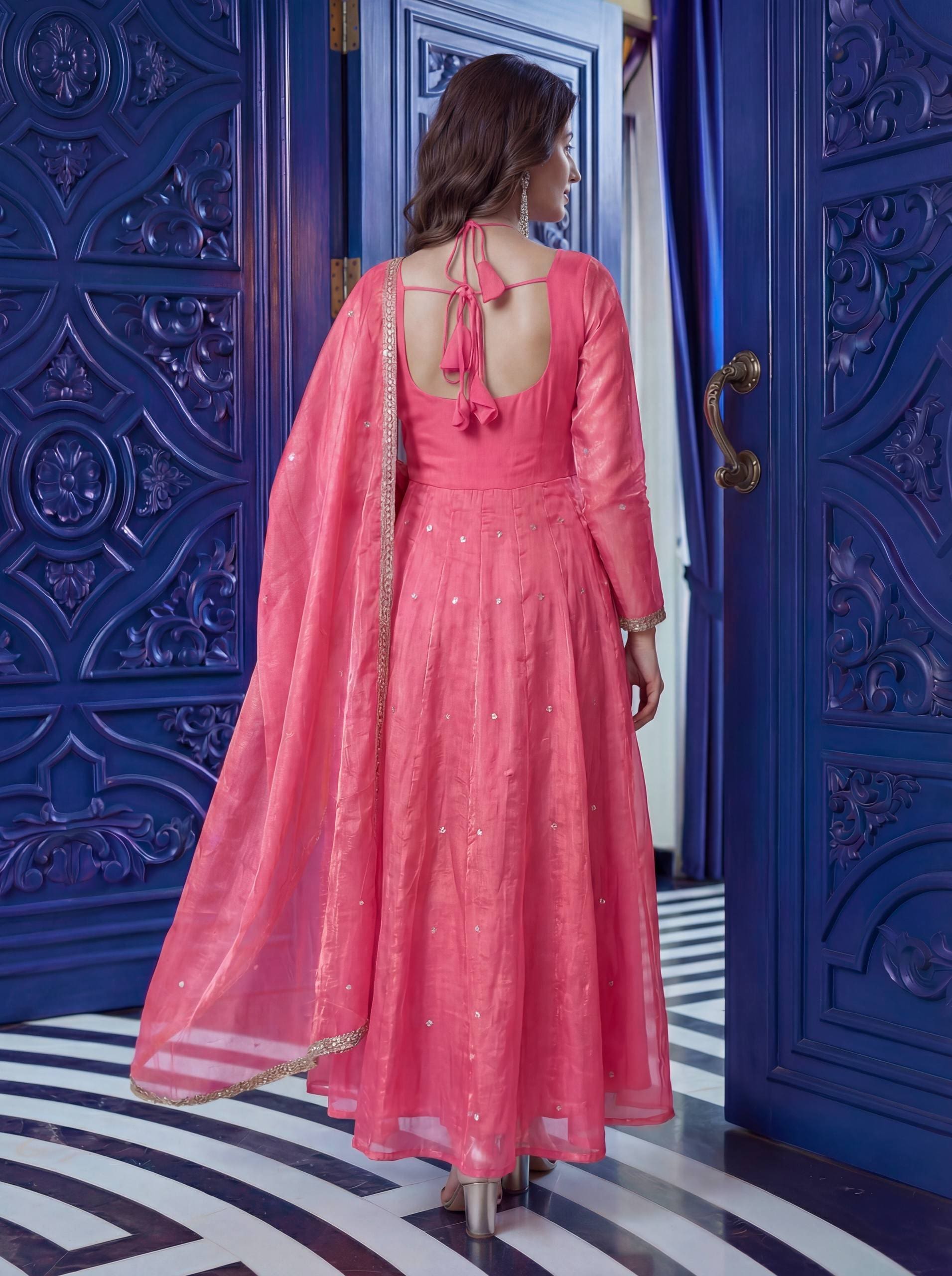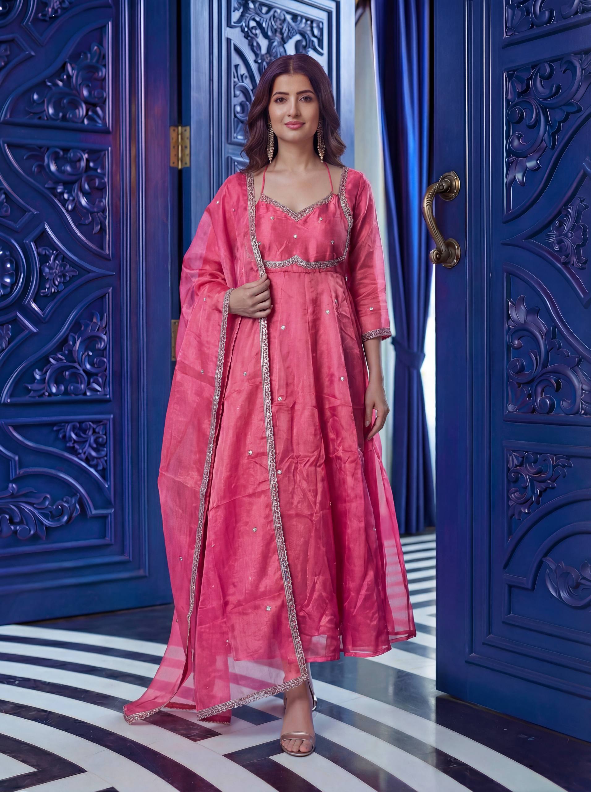 Designer Fandy Silk Gown Set with Dupatta & Bottom – Festive & Party Wear | RjPoshak