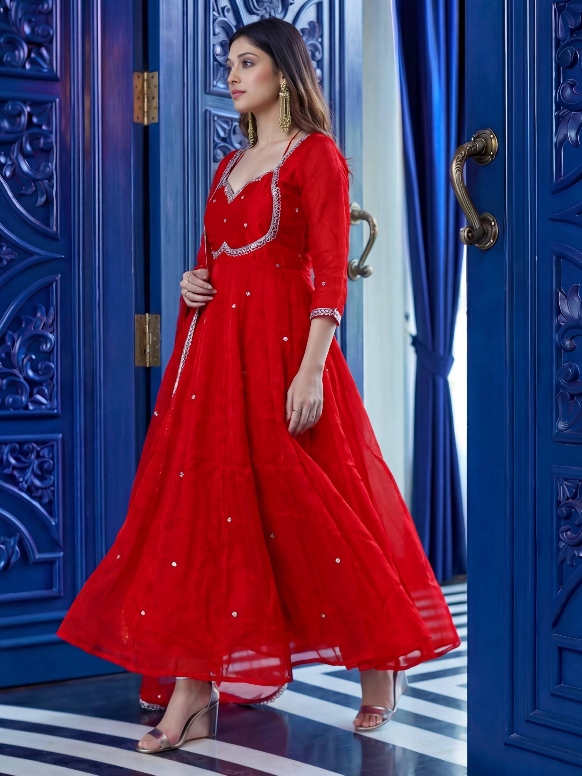 Enhance your festive and party look with this beautifully crafted Fandy Silk Gown Set from RjPoshak. Designed with rich embroidery and sequence work, this outfit offers a perfect blend of elegance, comfort and modern ethnic style. The flowing 3.5-meter flair gives a graceful silhouette, making it ideal for festivals, functions and special occasions.