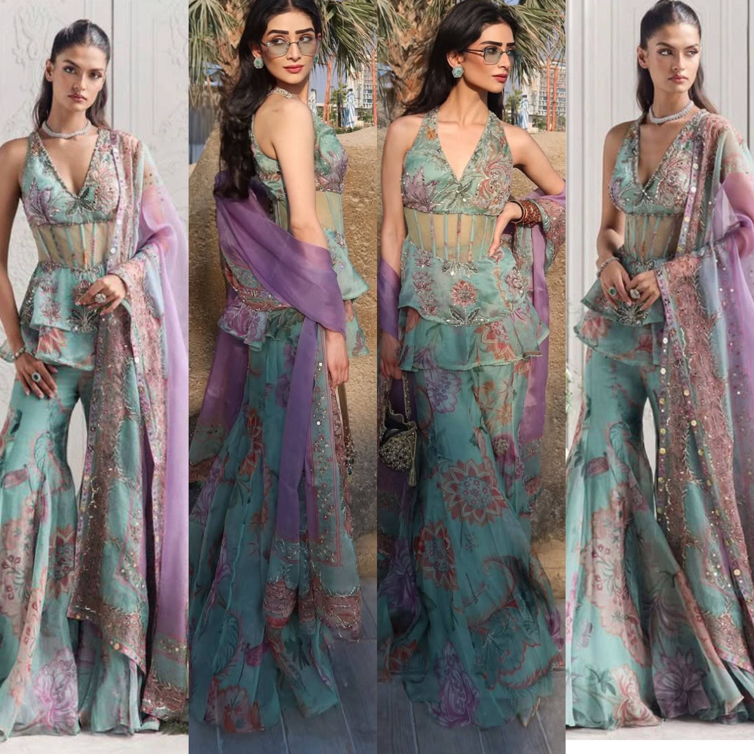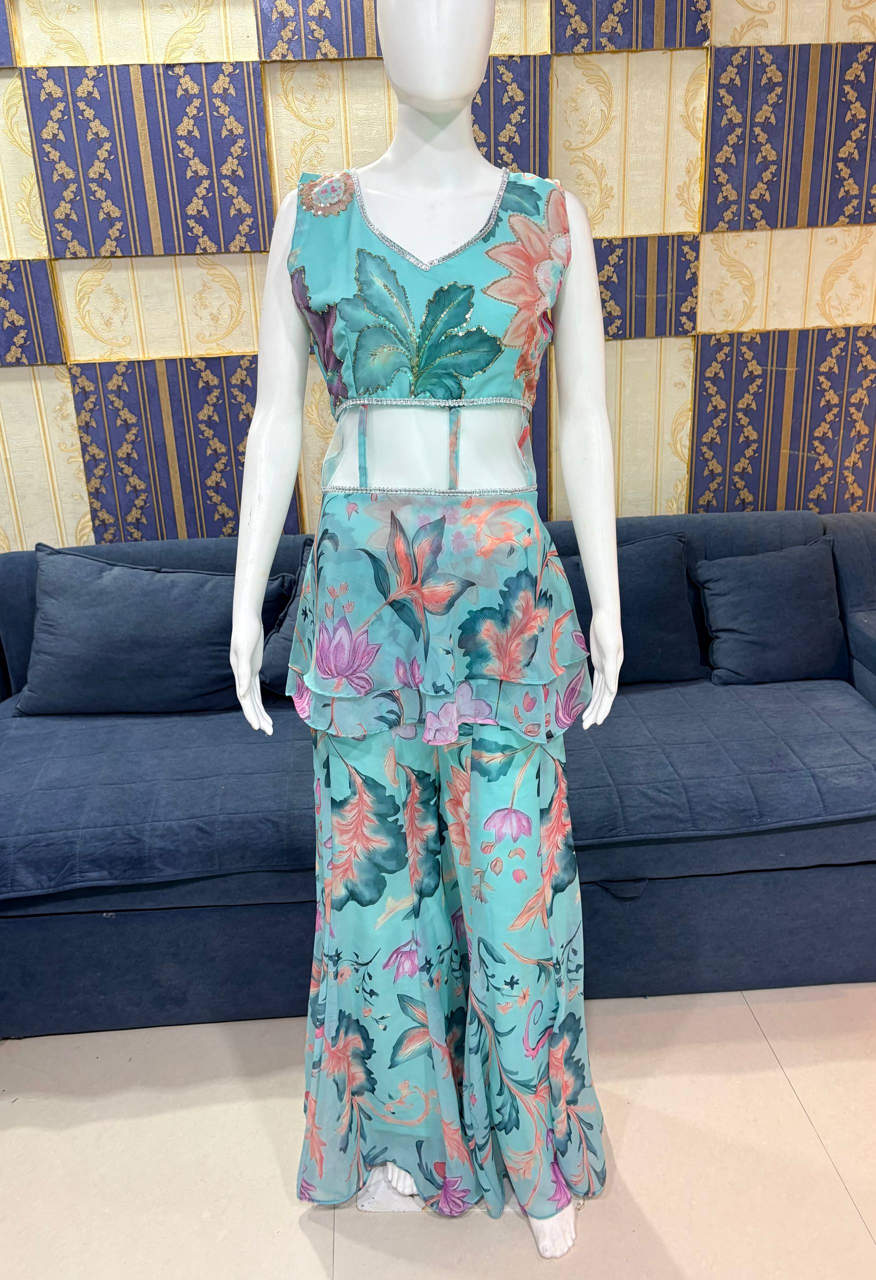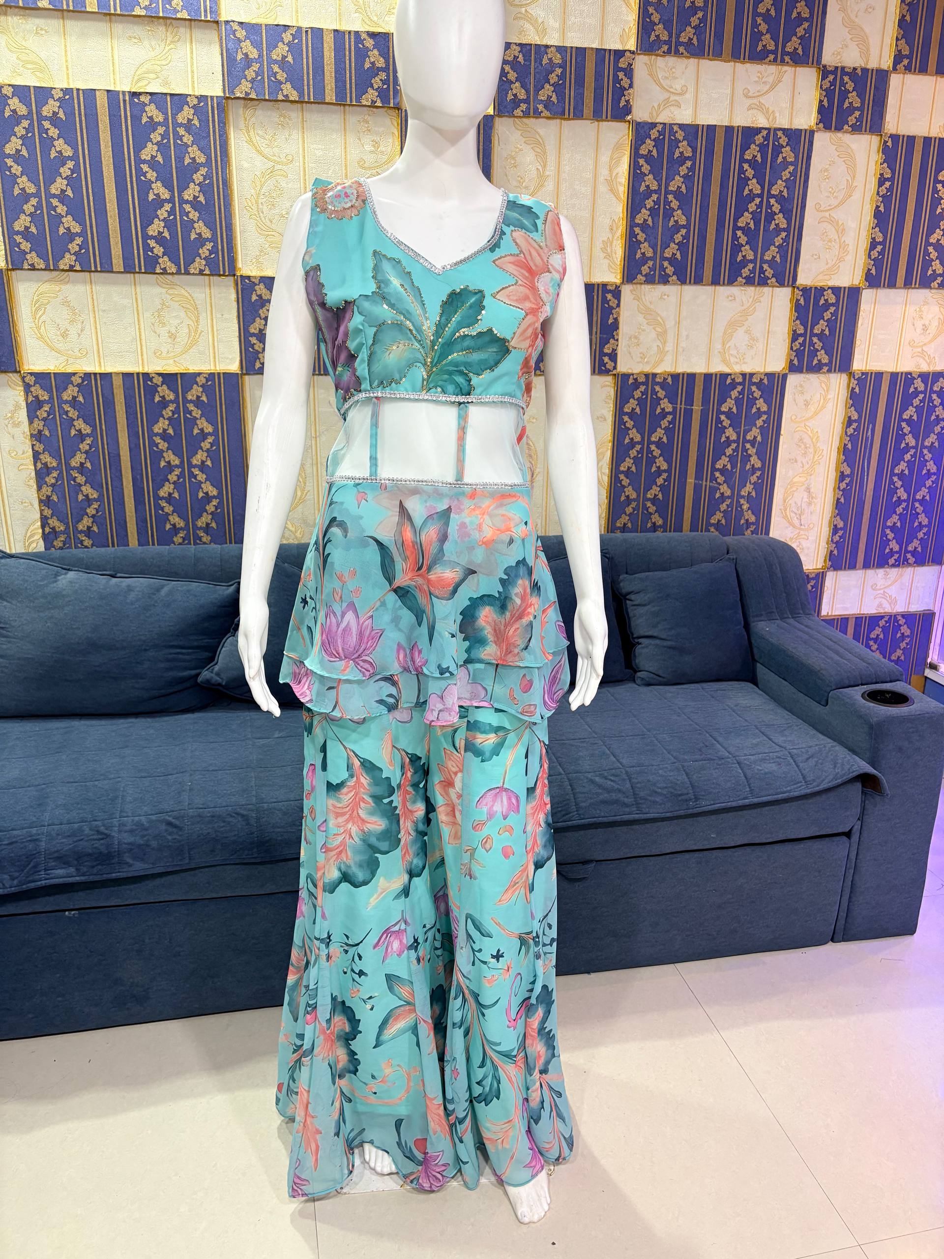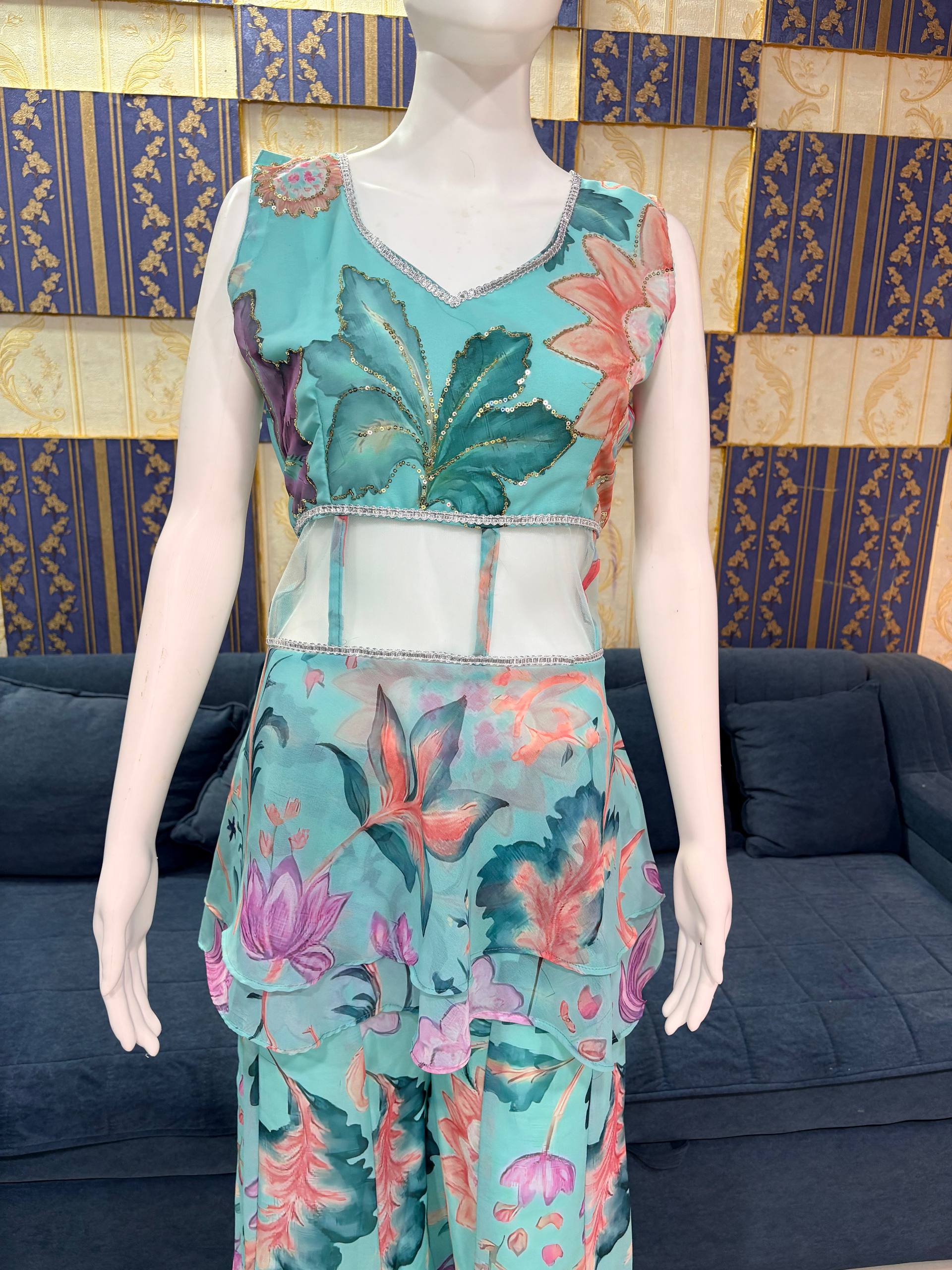 Upgrade your festive style with this elegant digital print top palazzo set from RjPoshak. Crafted in lightweight faux georgette with sequins detailing, this outfit offers comfort, graceful flow, and a modern designer look—perfect for parties, festive occasions, and day functions.
