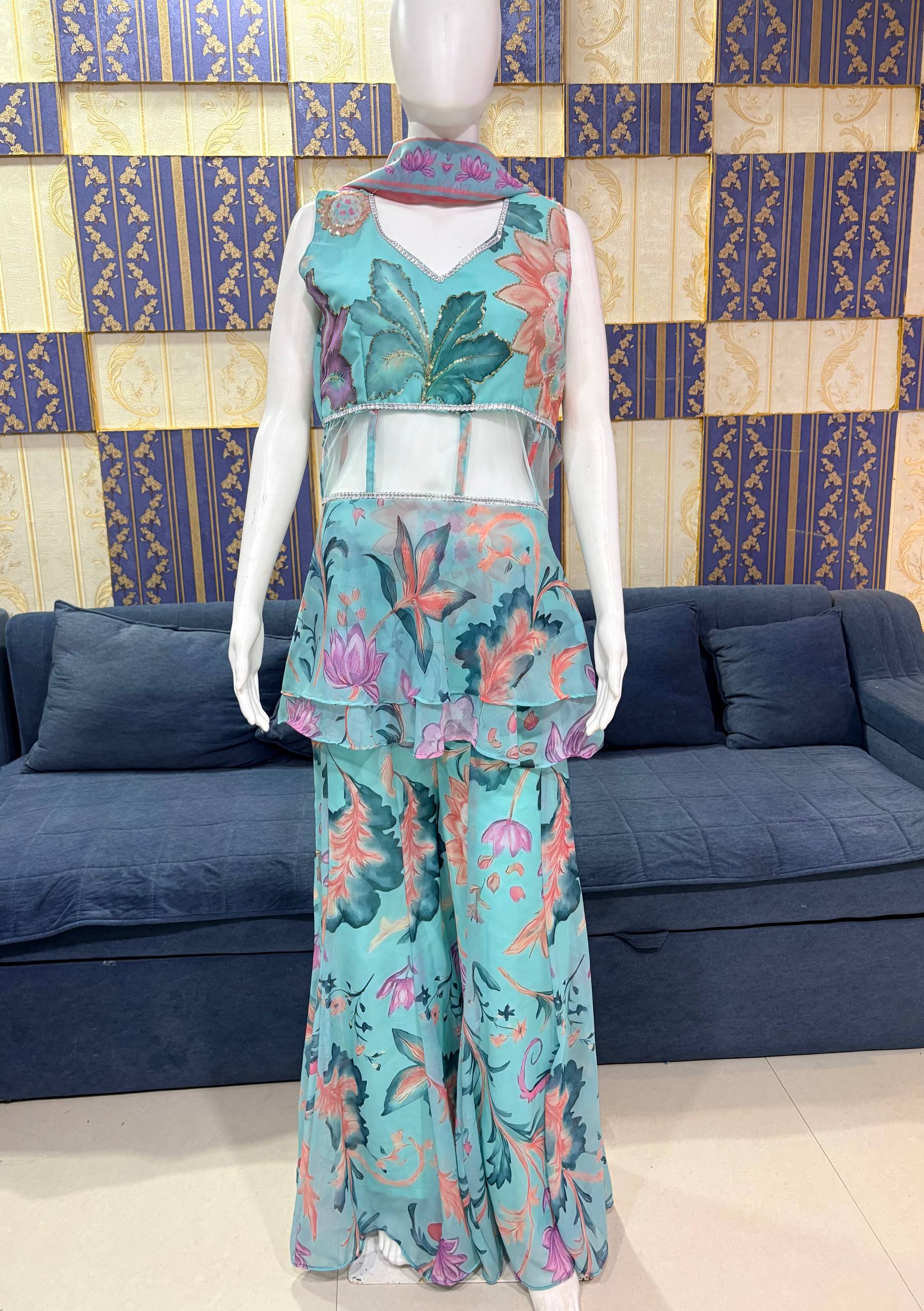 Sky Blue Digital Print Faux Georgette Top Palazzo Set with Dupatta – Party & Festive Wear | RjPoshak