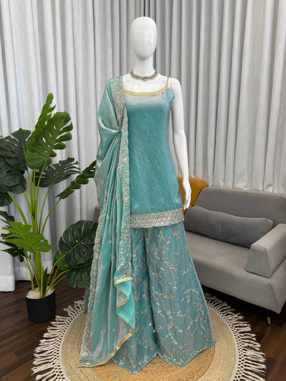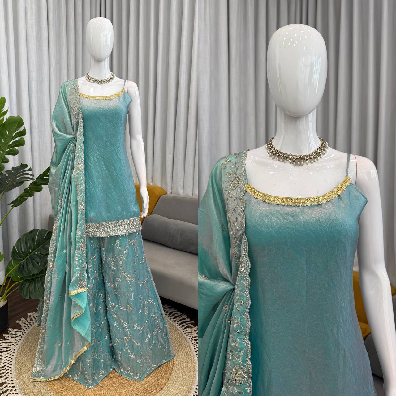 Upgrade your ethnic wardrobe with this elegant Designer Fendy Silk Top Plazo Dupatta Set from RjPoshak. Crafted with premium fabric and detailed thread sequins embroidery, this stylish 3-piece outfit includes a top, plazo and matching dupatta. Perfect for festive celebrations, parties, weddings and traditional occasions.