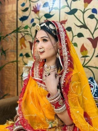 This iconic dress represents a rich cultural heritage, showcasing the grandeur and elegance of Rajput royalty and traditions.