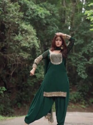 Elegant dark green 3-piece sharara set crafted in premium silk with thread and sequin embroidery. Fully stitched, comfortable fit, and perfect for festive, formal, and casual occasions.