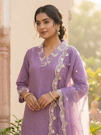 Sku — Lavender Tapasya Suit # Women’s Kurta Pent Dupatta Set #Top Fabric :-Tesla Work:- Embroidered Length :- 43/44 inch Size:- S(36″) M(38″) L(40″) XL(42″) XXL(44″) waist:- S(32″) M(34″) L(36″) XL(38″) XXL(40″) Sleeves length :- 3/4 Sleeves Top Type :- Kurta Colour : lavender #Bottom Fabric:- Tesla Length(Inch):- 39/40 Plus Waist:- S(32″) M(34″) L(36″) XL(38″)…