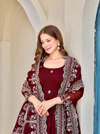 Premium maroon Anarkali suit set crafted in heavy crunchy silk with elegant thread and sequin embroidery. Ready-to-wear 3-piece outfit, perfect for festive events, parties, and elegant day wear.
