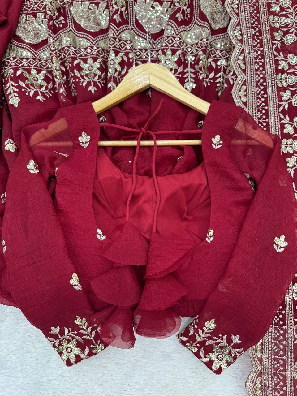 Premium maroon Anarkali suit set crafted in heavy crunchy silk with elegant thread and sequin embroidery. Ready-to-wear 3-piece outfit, perfect for festive events, parties, and elegant day wear.