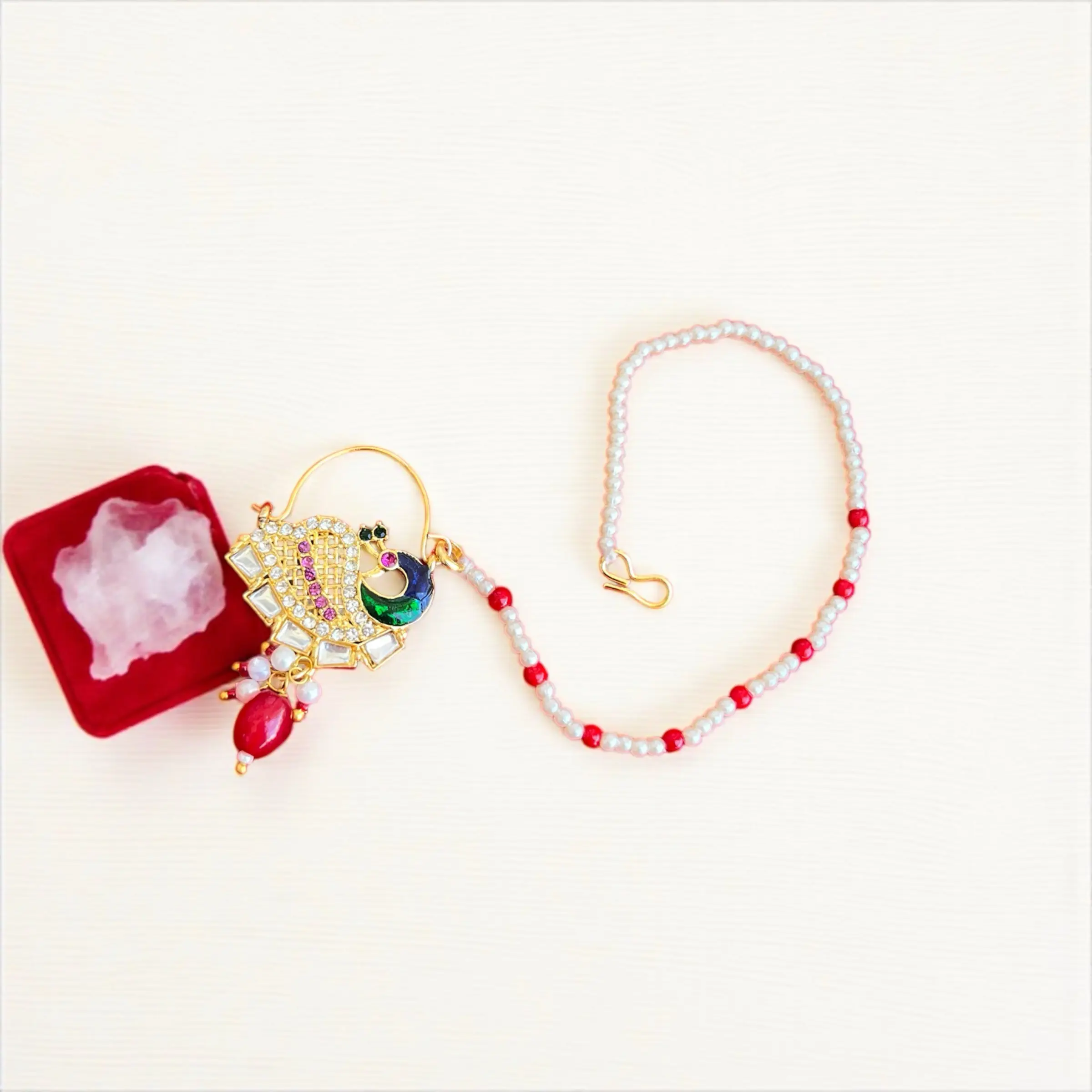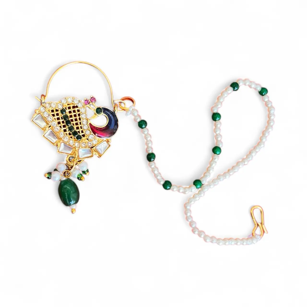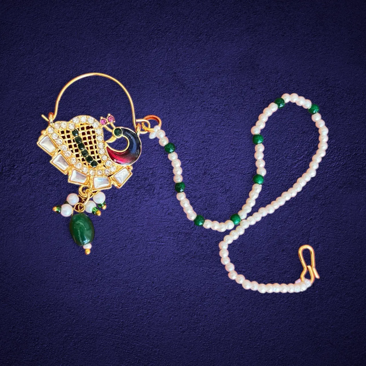 - Description: A bold and dramatic statement piece, this Rajasthani-inspired nathni features elaborate Kundan work set in a broad gold frame. The large hoop is decorated with intricate floral motifs and suspended by a long, multi-beaded chain, perfect for a regal bridal look.