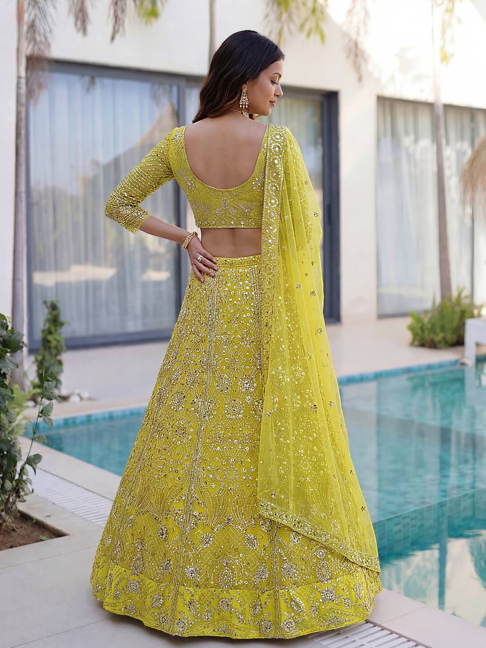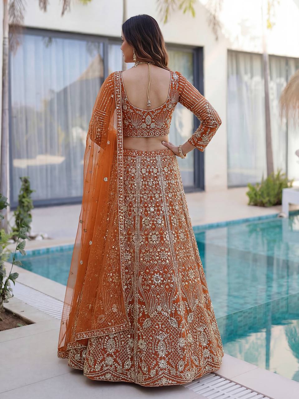 Enhance your festive and wedding look with this elegant RjPoshak Designer Lehenga Choli made from premium butterfly net fabric. Featuring beautiful sequins embroidery and a graceful 3 meter flare, this lehenga is perfect for weddings, receptions, and special occasions.