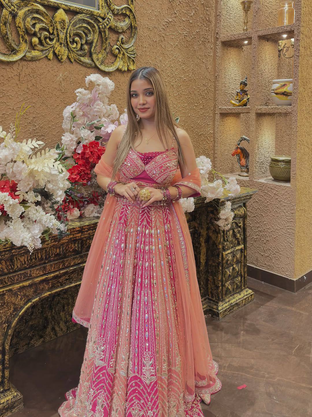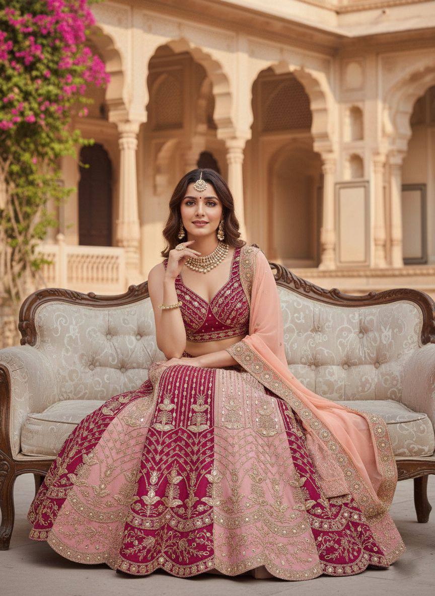 The beautifully designed lehenga features a grand 4 meter flare with attached can-can and canvas patta, creating a voluminous and elegant silhouette. The semi-stitched design allows comfortable fitting and customization up to size 44.