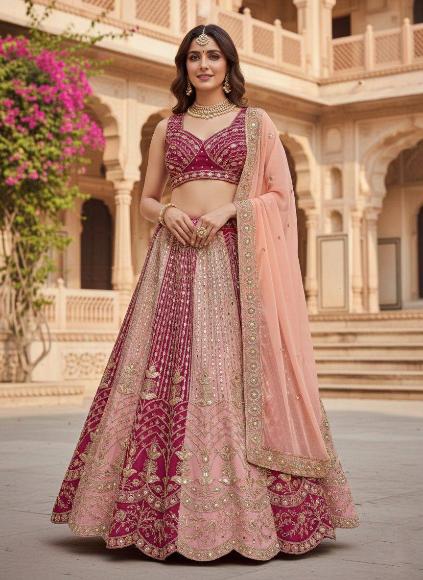 Elegant designer lehenga choli crafted with premium faux georgette fabric featuring heavy coding sequins, real mirror and stone work. This beautiful ethnic outfit from RjPoshak comes with a grand 4 meter flare, can-can and canvas layers, making it perfect for weddings, festivals and party wear.