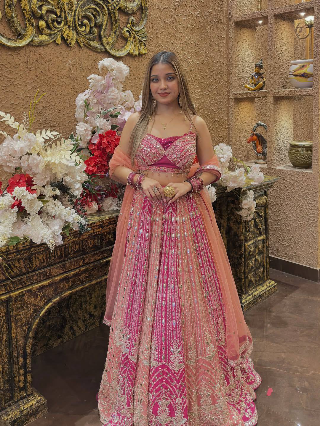 Completing the outfit is a stylish faux georgette dupatta decorated with sequins coding and real mirror work, adding a graceful finishing touch to the entire look.