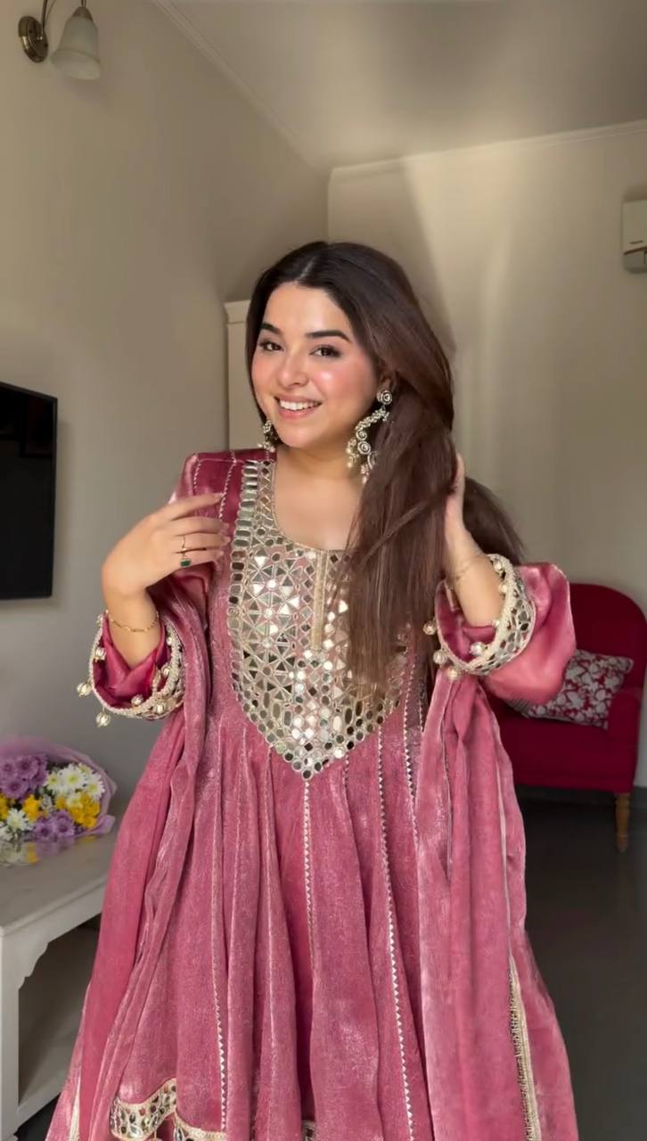 Make a bold ethnic statement with this stunning RjPoshak Designer Dhoti Style Suit Set crafted in luxurious gold crush fabric. Featuring real mirror work, elegant thread embroidery, and a stylish dhoti-style pant, this outfit is perfect for festive occasions, parties, and modern traditional looks.