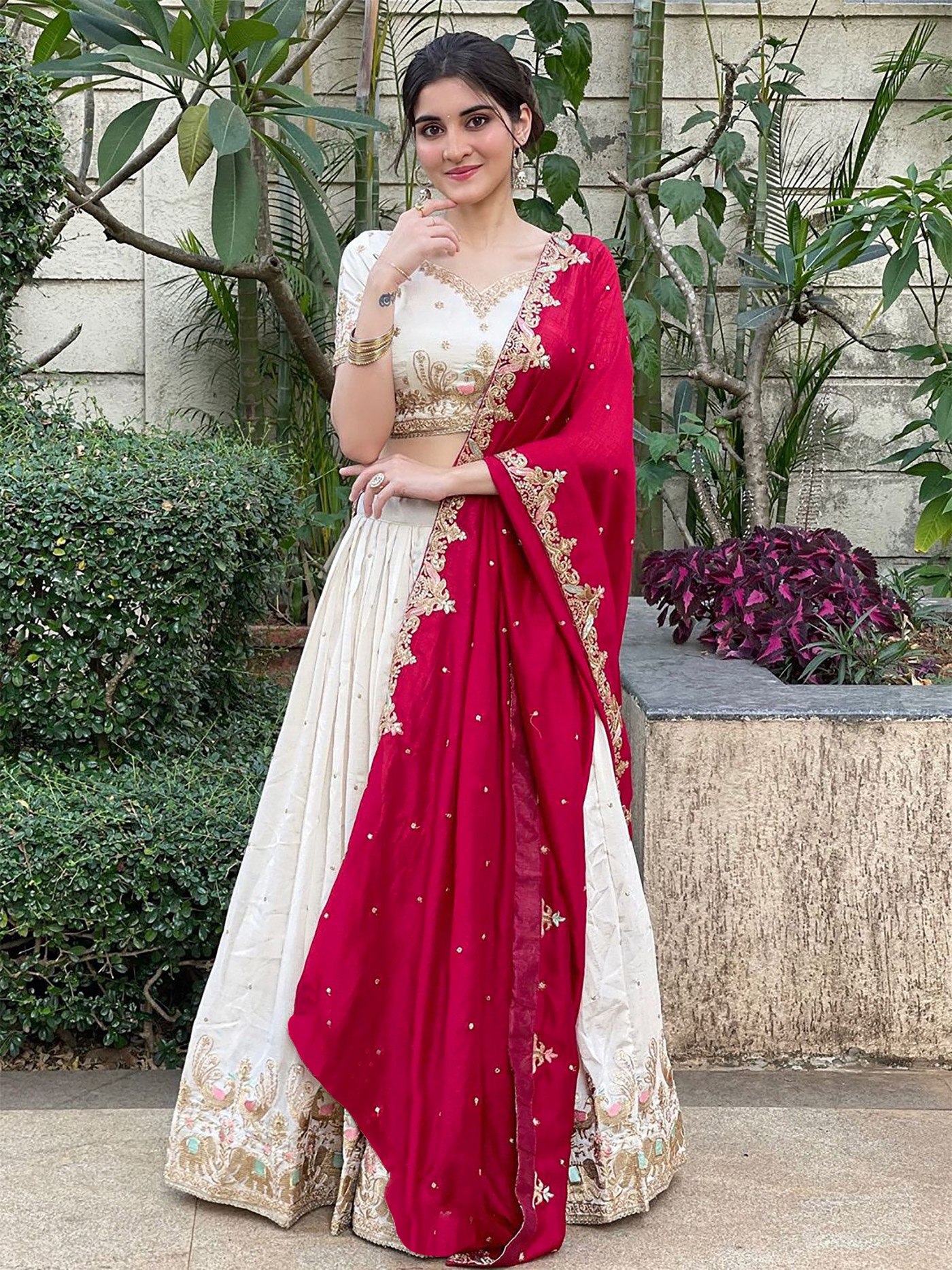 Step into elegance with this RjPoshak White Chinon Lehenga Choli, featuring delicate zari embroidery and a lightweight, graceful flare. Perfect for festive wear, small functions, and party occasions.
