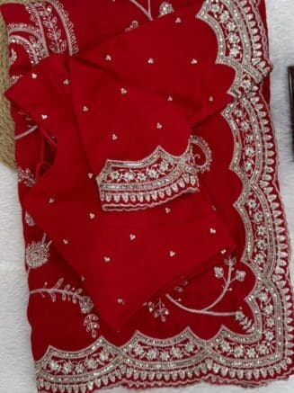 “Make a bold statement with this rich red saree, perfect for weddings, festivals, and special celebrations.”
