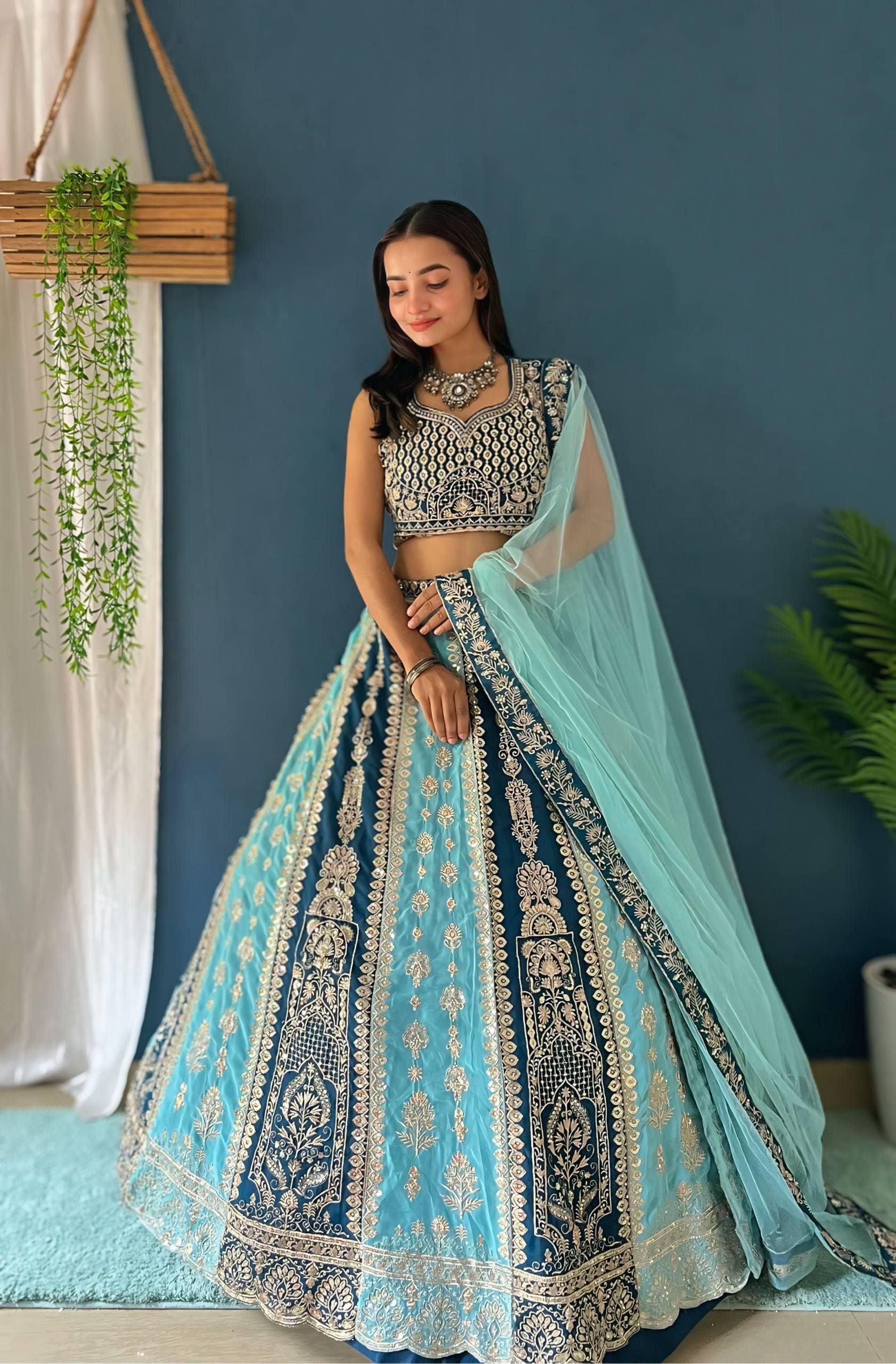 Step into timeless elegance with this beautifully crafted Teal Blue & Sky Blue Combination Lehenga Choli by RjPoshak. Designed for women who love graceful ethnic fashion, this outfit blends traditional embroidery with modern charm — making it ideal for weddings, receptions, festive celebrations, and special occasions. DVD ON MC9238